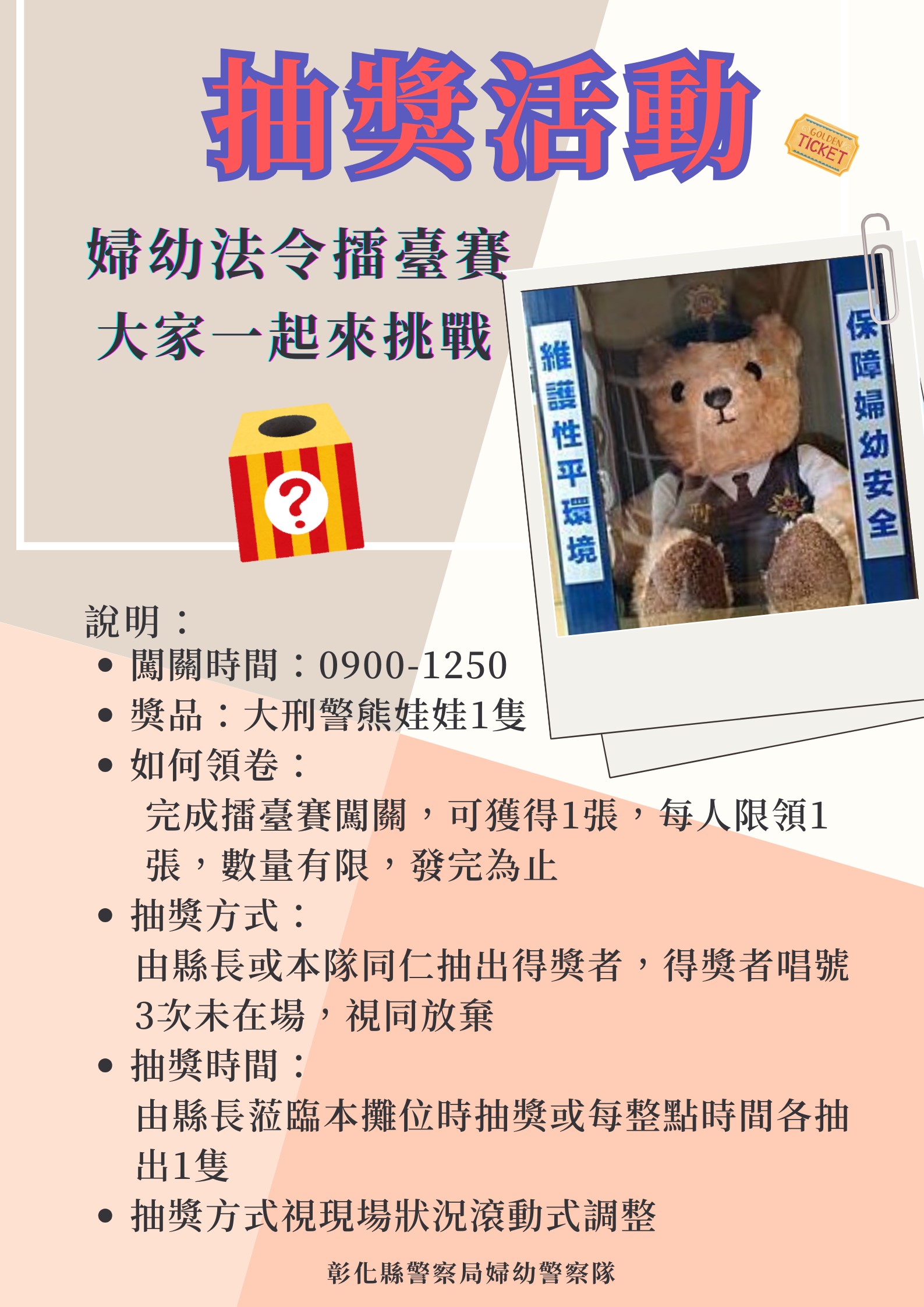 現場提供大刑警熊娃娃5隻供參賽民眾摸彩🎁