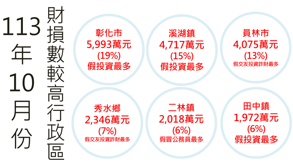 彰化縣10月份受理數最多的3個分局,多屬人口數稠密分局,依序為彰化分局(190件)、員林分局(142件)、鹿港分局(90件);財損金額最多3個分局,依序為彰化分局(7,741萬元)、員林分局(6,078萬元)、溪湖分局(4,974萬元)。依行政區統計,受理件數最多的3個行政區,依序為彰化市(141件)、員林市(81件)、鹿港鎮(52件);財損金額最多依序為彰化市(5,993萬元)、溪湖鎮(4,717萬元)、員林市(4,075萬元)。提醒上述區域民眾,仍應留意詐騙資訊。