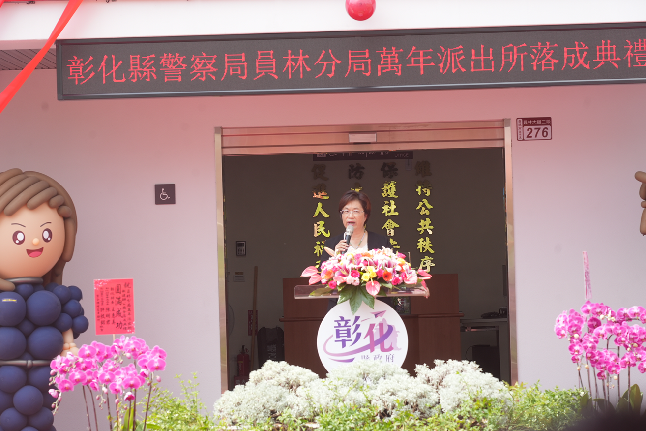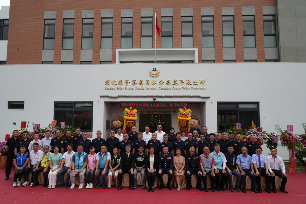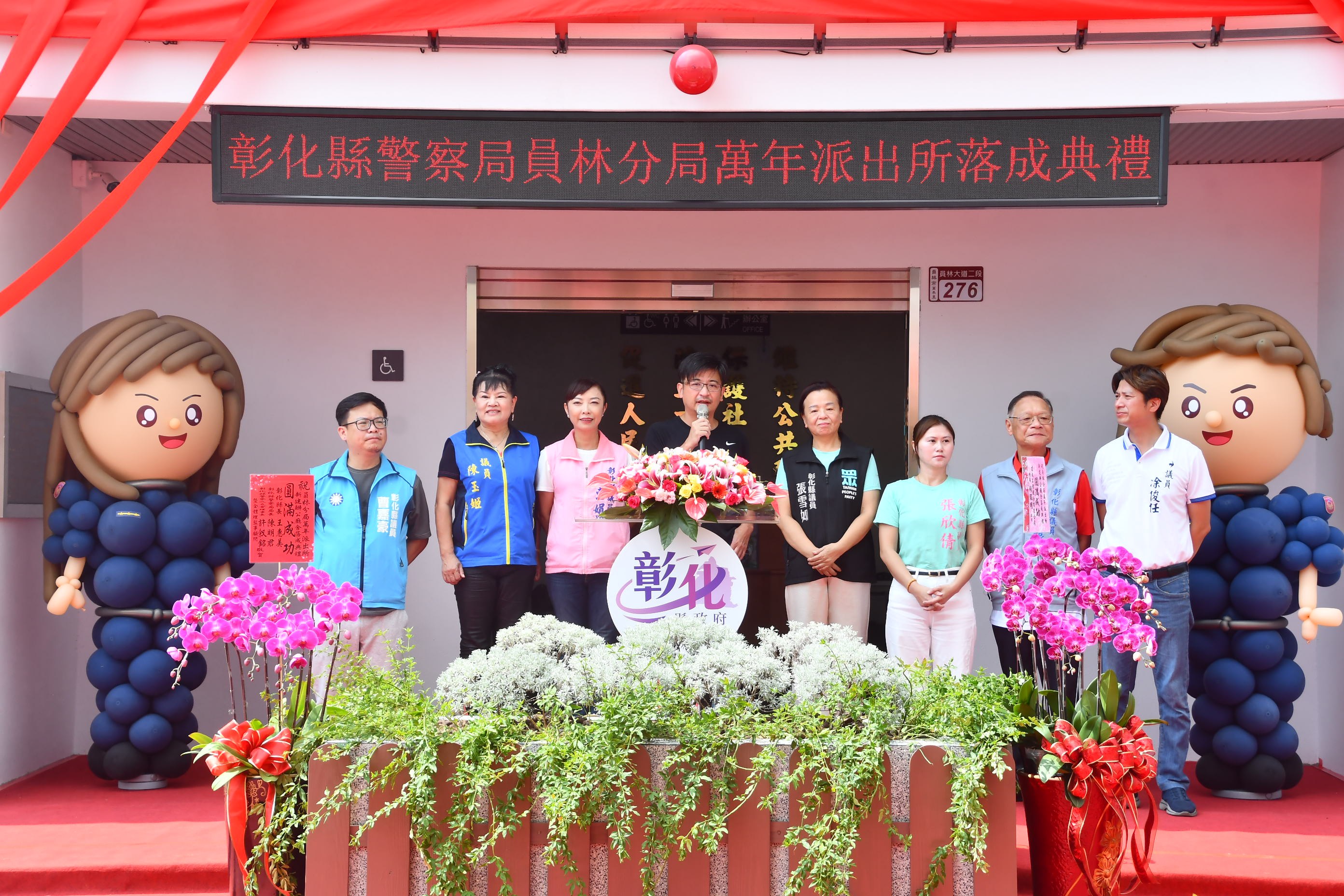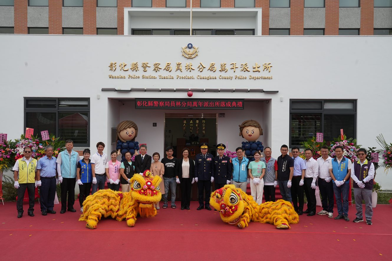 彰化縣警察局員林分局萬年派出所新建辦公廳舍落成典禮,於今(4)日上午由縣長王惠美主持揭牌儀式,議長謝典林及地方民意代表共同剪綵揭牌。王縣長表示,員林自2015年由鎮升格為市後,南區人口成長快速,在員林市公所與代表會、議會及警察局的建議之下,縣府於111年3月開始規劃設計萬年派出所,興建經費新臺幣4,983萬6仟元,感謝議長謝典林及所有議員們對警察局辦公廳舍預算的支持,終於落成啟用,這是員林分局的第9間派出所,在彰化縣內則是第73間派出所,除了這次落成啟用的萬年派出所外,另外還有15處警察局綜合行政大樓辦公廳舍的整修興建,合計編列預算約10.3億元,感謝在大家的共同努力下,在交通治安各面向評比都名列前茅,期待未來一起努力讓彰化更好更進步。