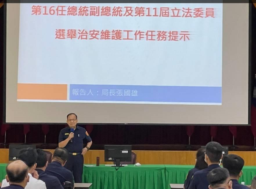 局長張國雄授課時強調查察賄選、假訊息、境外資金介入、選舉賭盤等妨害選舉案件是當前重要治安工作,更要求員警對於候選人、競選處所、活動的安全維護勤務一定要妥適規劃,絕不允許暴力介入選舉,遇案一定深入追查、依法究辦,維持選舉期間的治安平穩是警察的重點任務,要求警察同仁務必全力以赴,了解任務、齊力澈底淨化選前治安環境,共同做好「投票日前-平安、投票日-平順、投票日後-平穩」之目標。