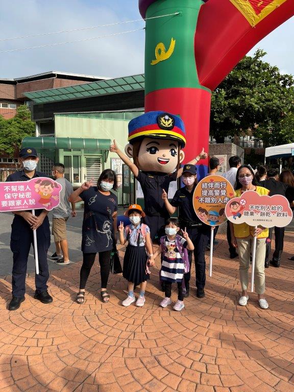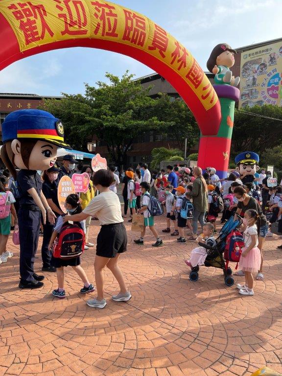 本日警察局派員到員林市員林國小扮起警察大頭娃娃迎接開心上學的孩童,並舉起宣導標語牌「結伴而行,提高警覺,不跟別人走」、「叫、推、逃!找人幫忙」、「背心短褲覆蓋處,不讓人觸摸」傳達正確觀念,提升兒童自我保護安全觀念,小朋友看到警察大頭娃娃,可愛的造型、逗趣的肢體動作,都興奮地揮手打招呼,雀躍不已,也藉此告訴孩子,警察不是嚴肅、威權的象徵,如遇到危險要勇於向平易近人的警察叔叔、阿姨求助。