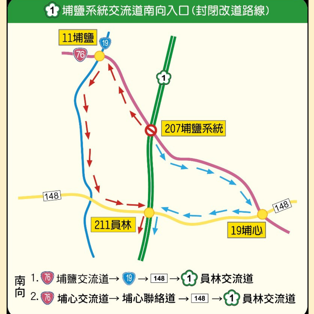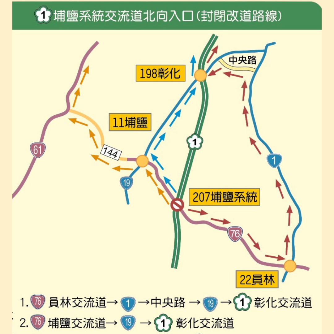 (一) 員林、溪湖地區民眾改道行駛縣148線(員鹿路)、台1線(中山路)、台19線(彰水路)、縣150線(斗苑路),選擇由北斗交流道上國道1號。