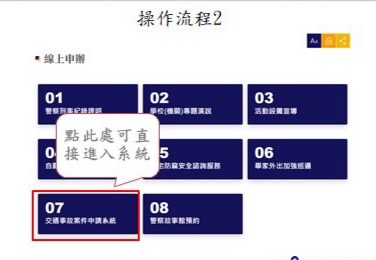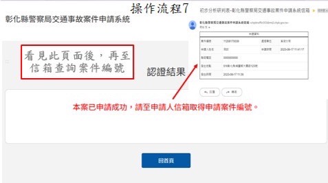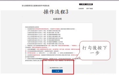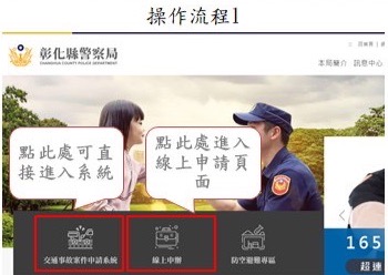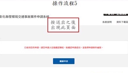 爾後民眾各類交通事故案件均可由網路申請,申請系統的操作方式,從「彰化縣警察局全球資訊網」進入,在首頁點選「交通事故案件申請系統」或「線上申辦」,再依操作流程(如附圖)填寫資料即完成申請,請民眾善加利用。