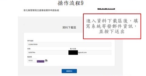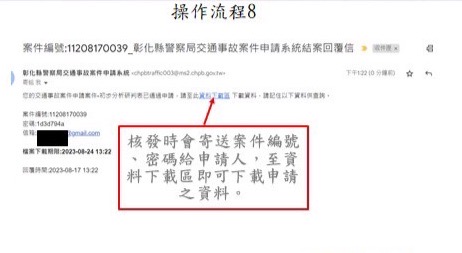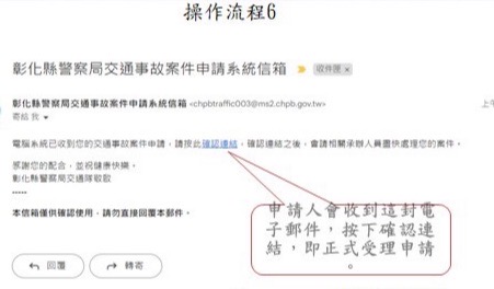 彰化縣警察局為提供交通事故當事人更便民的服務,新建置交通事故申請系統在警察局全球資訊網網站供民眾申請,系統新增電子郵件方式寄送至申請人的功能,在民眾發生交通事故後,可由該系統申請現場圖、照片等事故資料,再以電子郵件寄送給申請人,讓當事人利用網路申請及領取,不用再舟車勞頓往返申請。