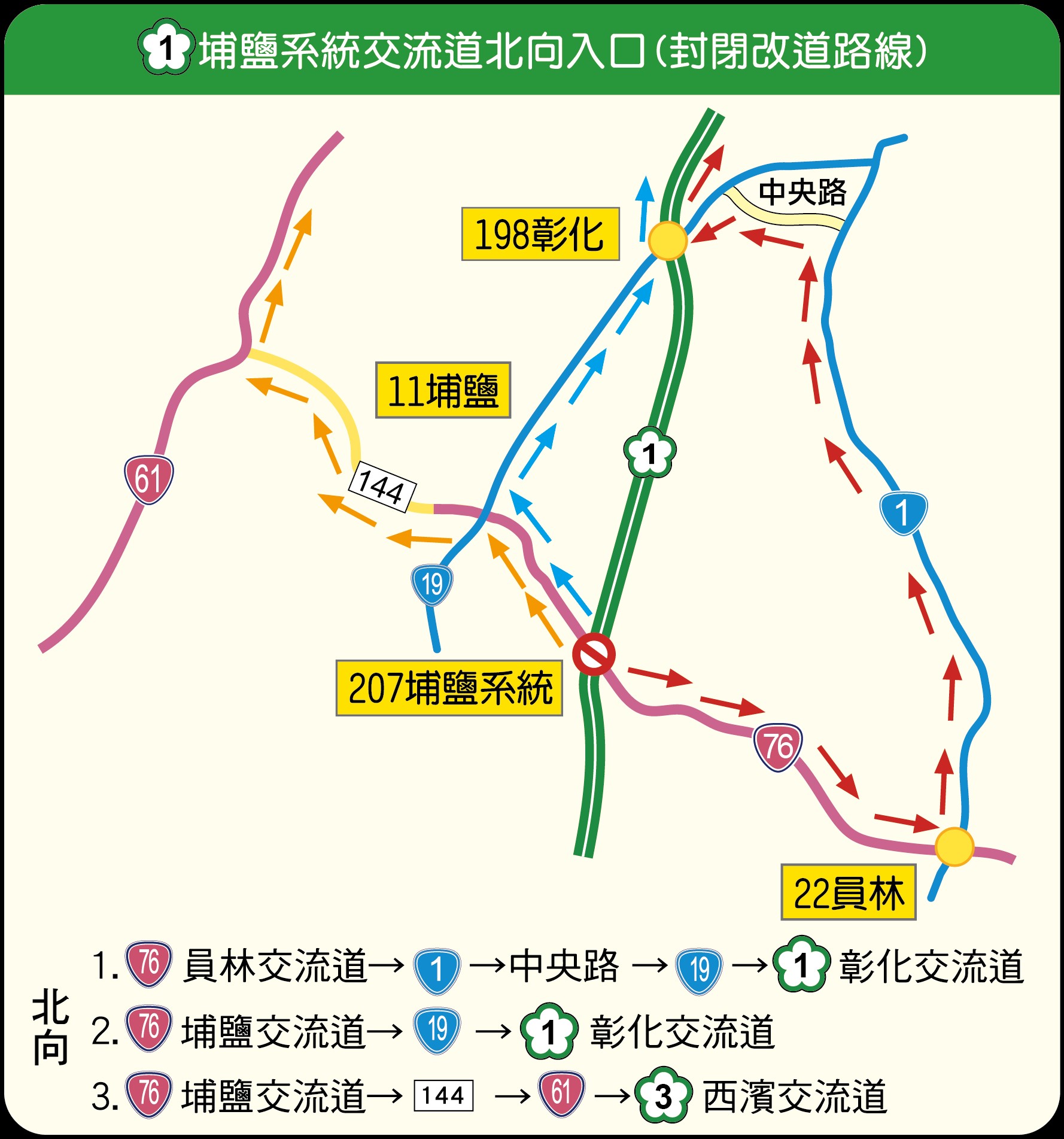 (二) 台76線欲轉國道1號北上,可由台76線埔鹽交流道→台19線(彰水路)→國道1號彰化交流道,或由台76線員林交流道→台1線→國道1號彰化交流道。