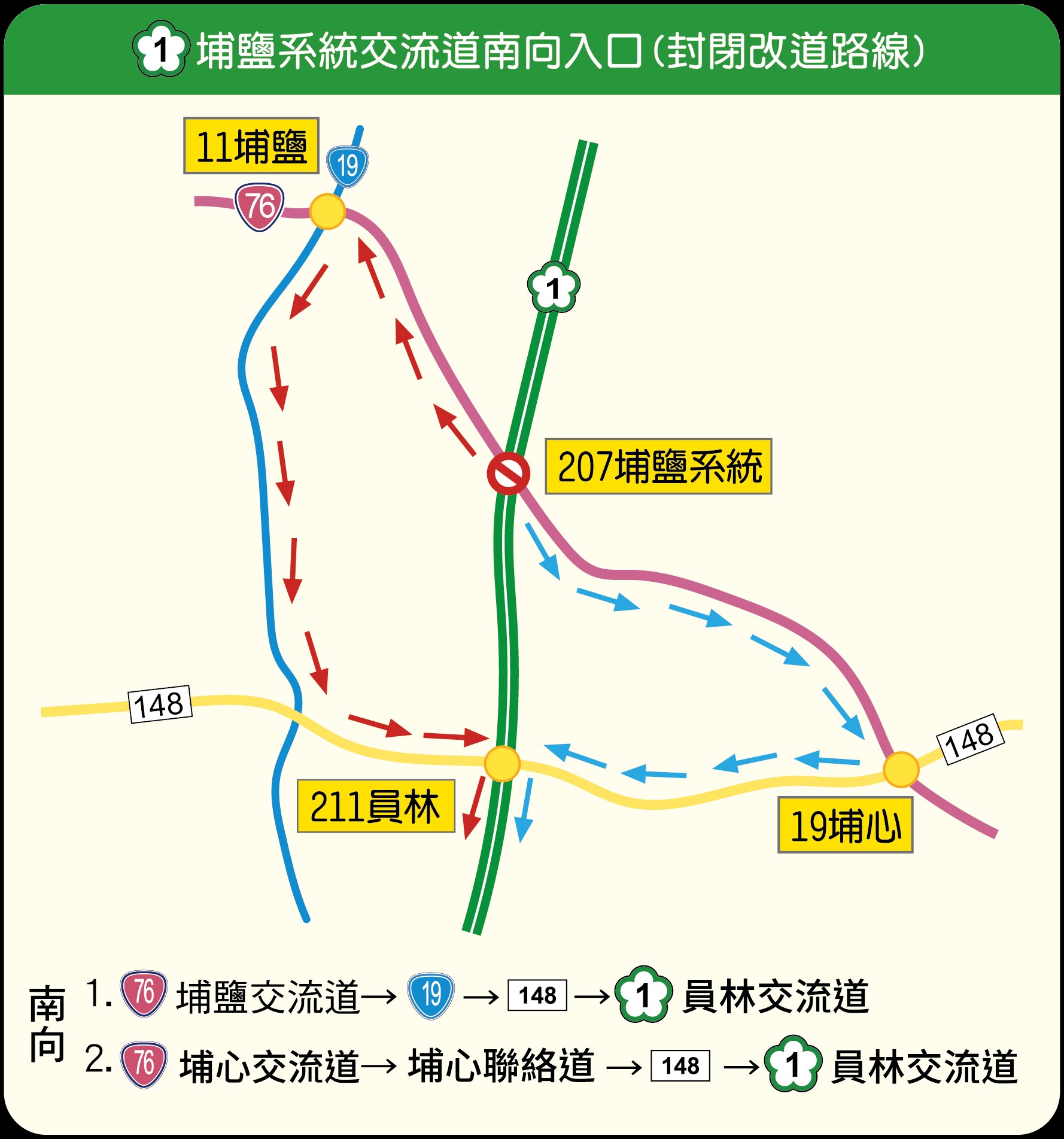 (一) 台76線欲轉國道1號南下的民眾,可由埔心交流道→埔心聯絡道→右轉縣148線(員鹿路)→國道1號員林交流道,或由台76線埔鹽交流道→台19線(彰水路)→左轉縣148線(員鹿路)→國道1號員林交流道。
