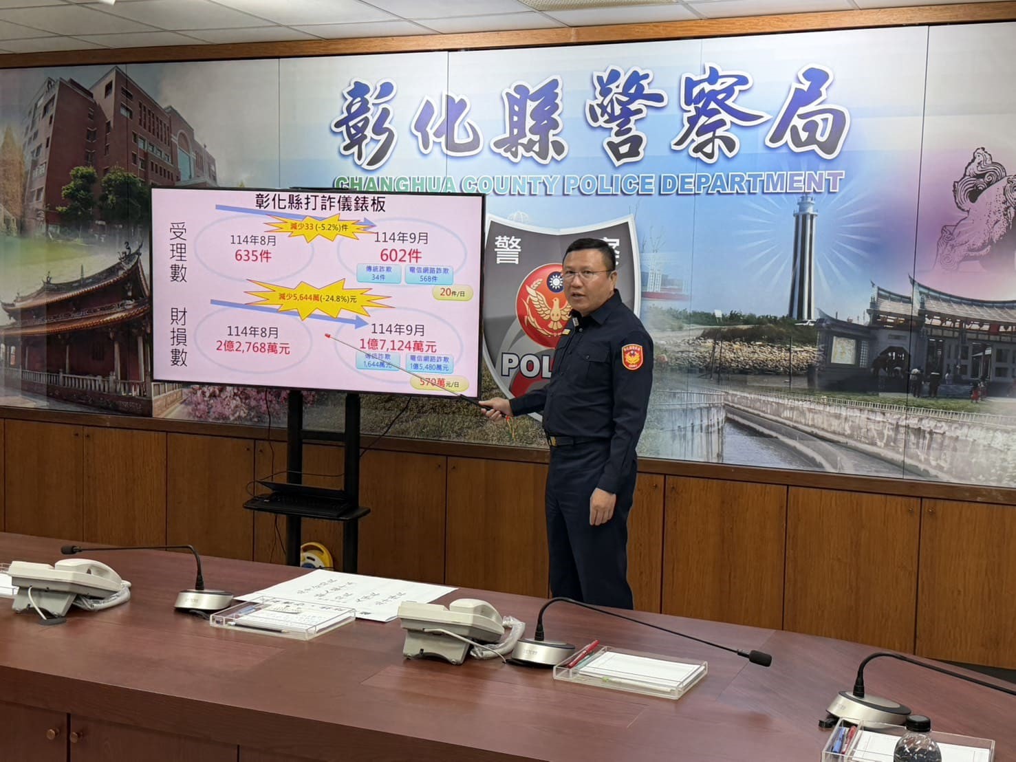 彰化縣警察局由局長陳明君親自主持記者會,透過打詐儀錶板,說明114年9月份彰化縣轄內詐騙現況,114年9月份受理件數602件及財損數新臺幣(以下同)1億7,124.7萬元;以每十萬人口數統計,彰化縣9月份平均受理詐欺案48.95件(全國排列第14),平均財損金額約1,392.4萬元(全國排列第15),治安相對穩定。