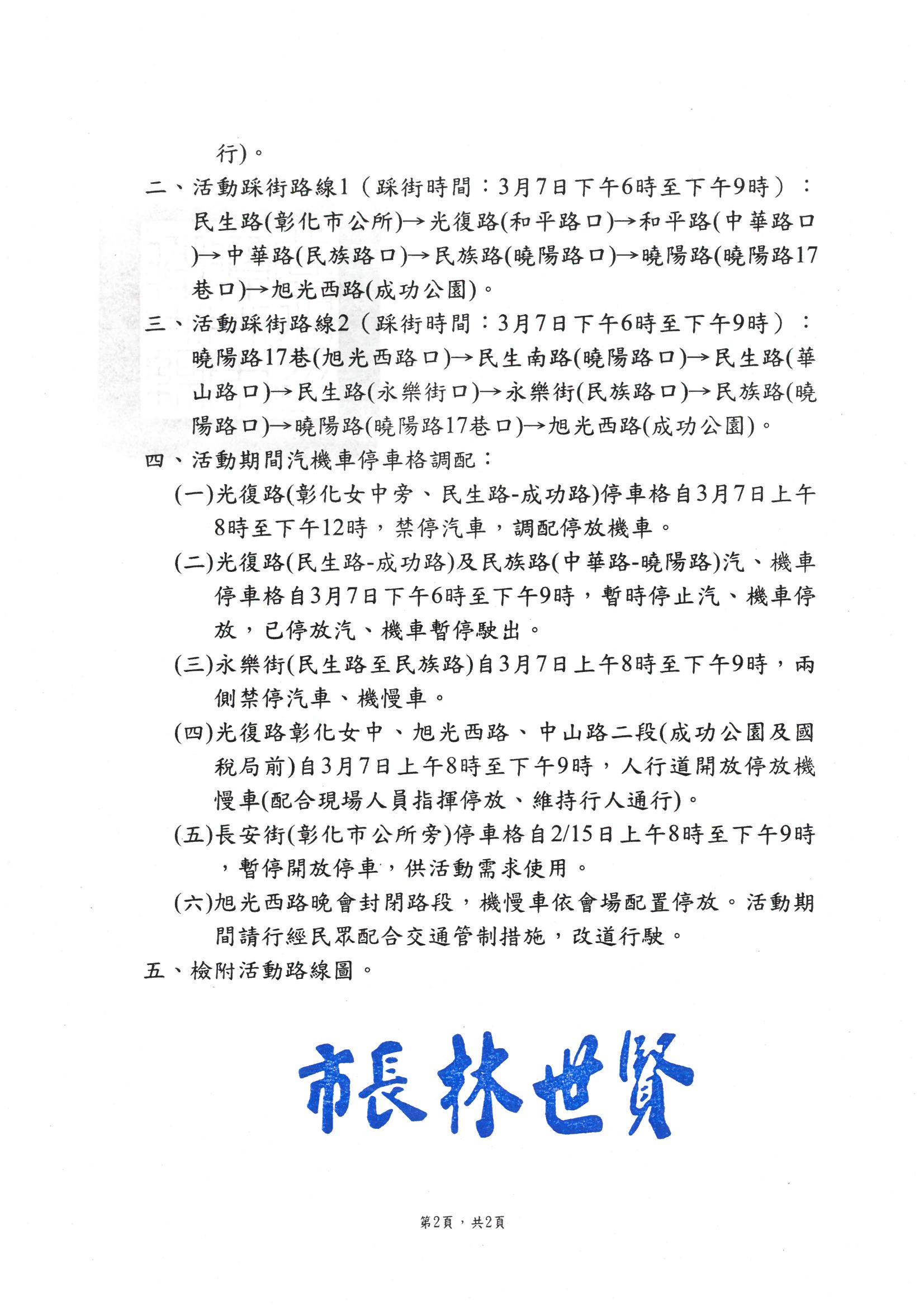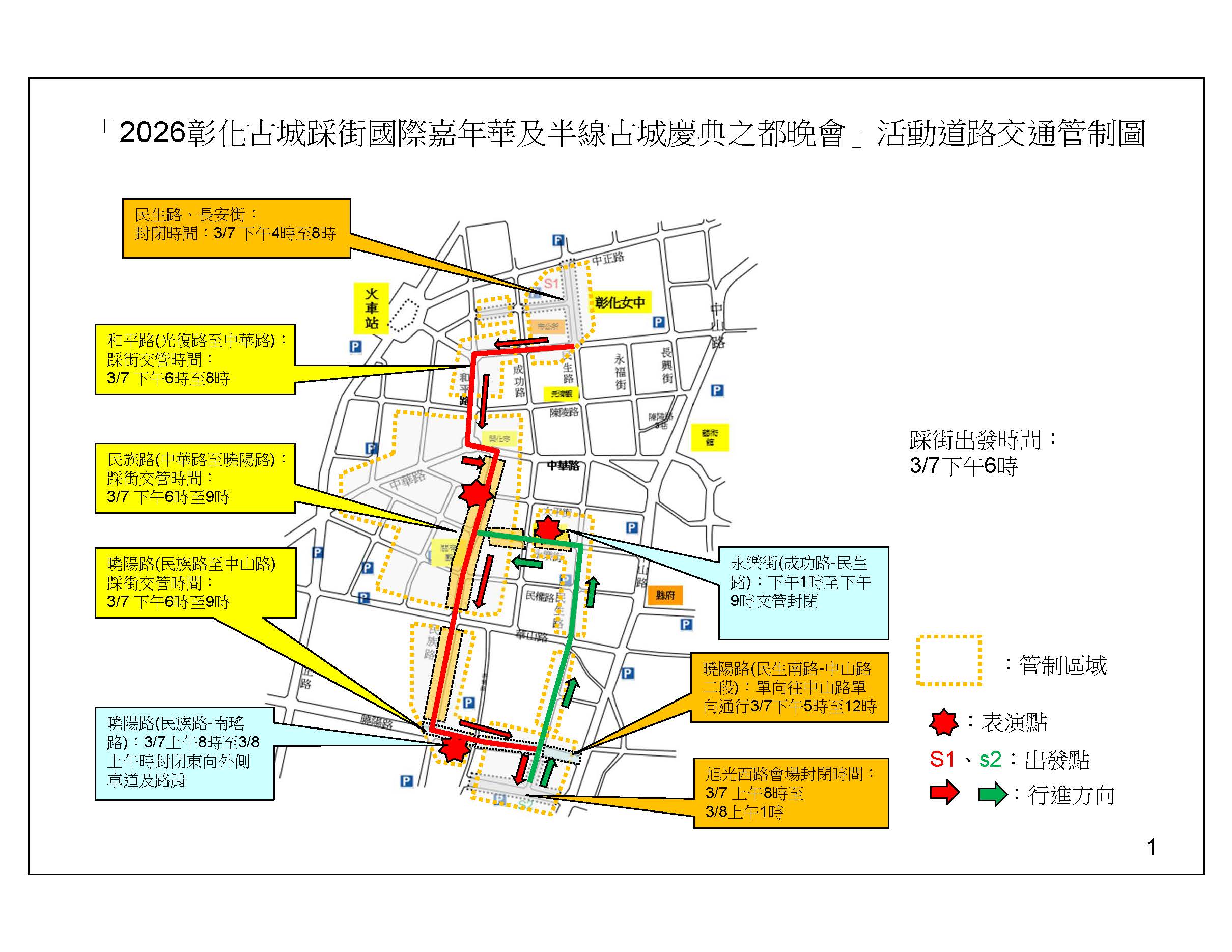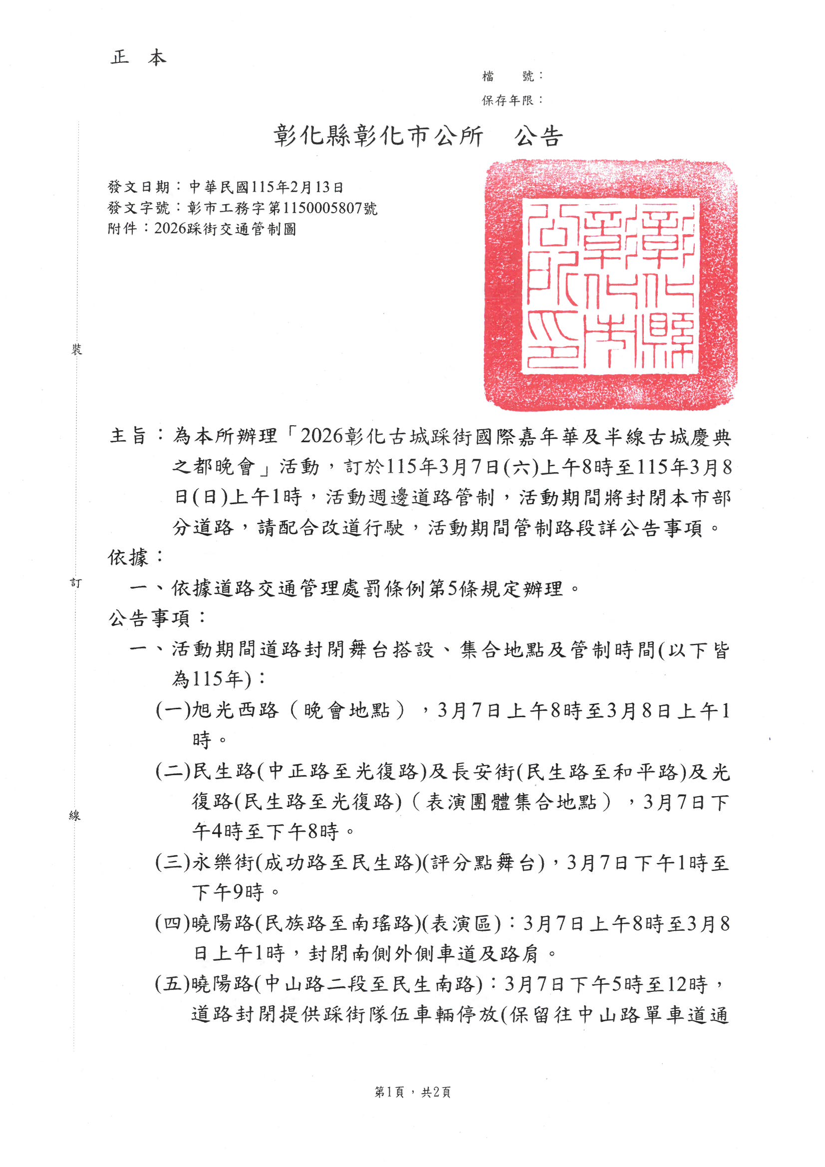 主旨:為本所辦理「2026彰化古城踩街國際嘉年華及半線古城慶典之都晚會」活動,訂於115年3月7日(六)上午8時至115年3月8日(日)上午1時,活動週邊道路管制,活動期間將封閉本市部分道路,請配合改道行駛,活動期間管制路段詳公告事項。