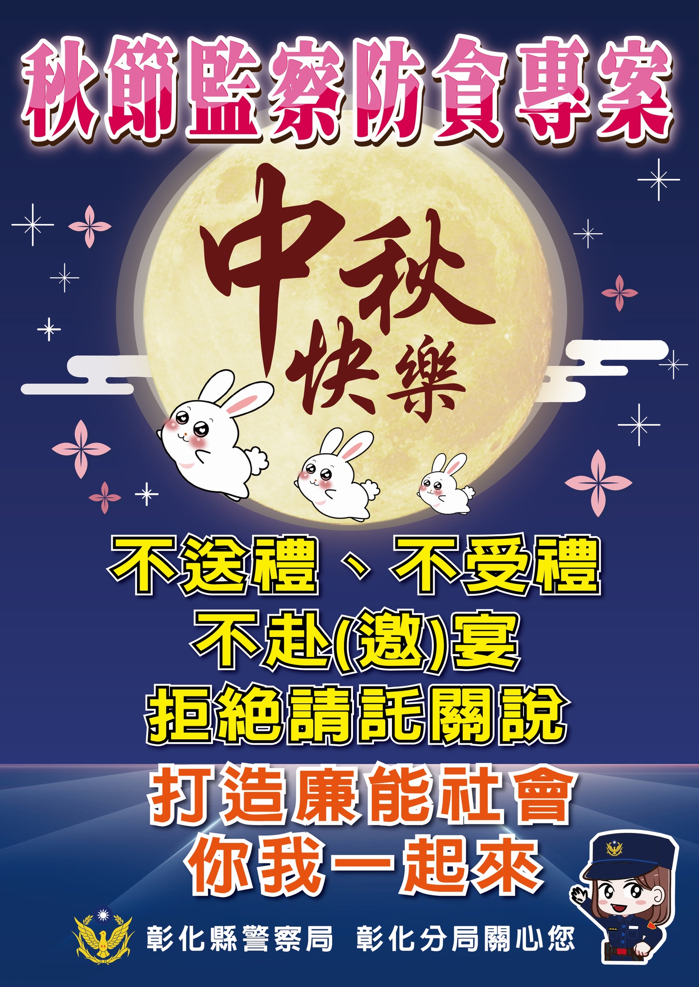 114年中秋節將屆,為端正警察風紀,革除陋規積習及杜絕紅包文化之決心,本分局確遵「不送禮、不受禮、不赴(邀)宴、拒受不當請託關說」之公務員廉政倫理規範,請大家一起共同響應支持。