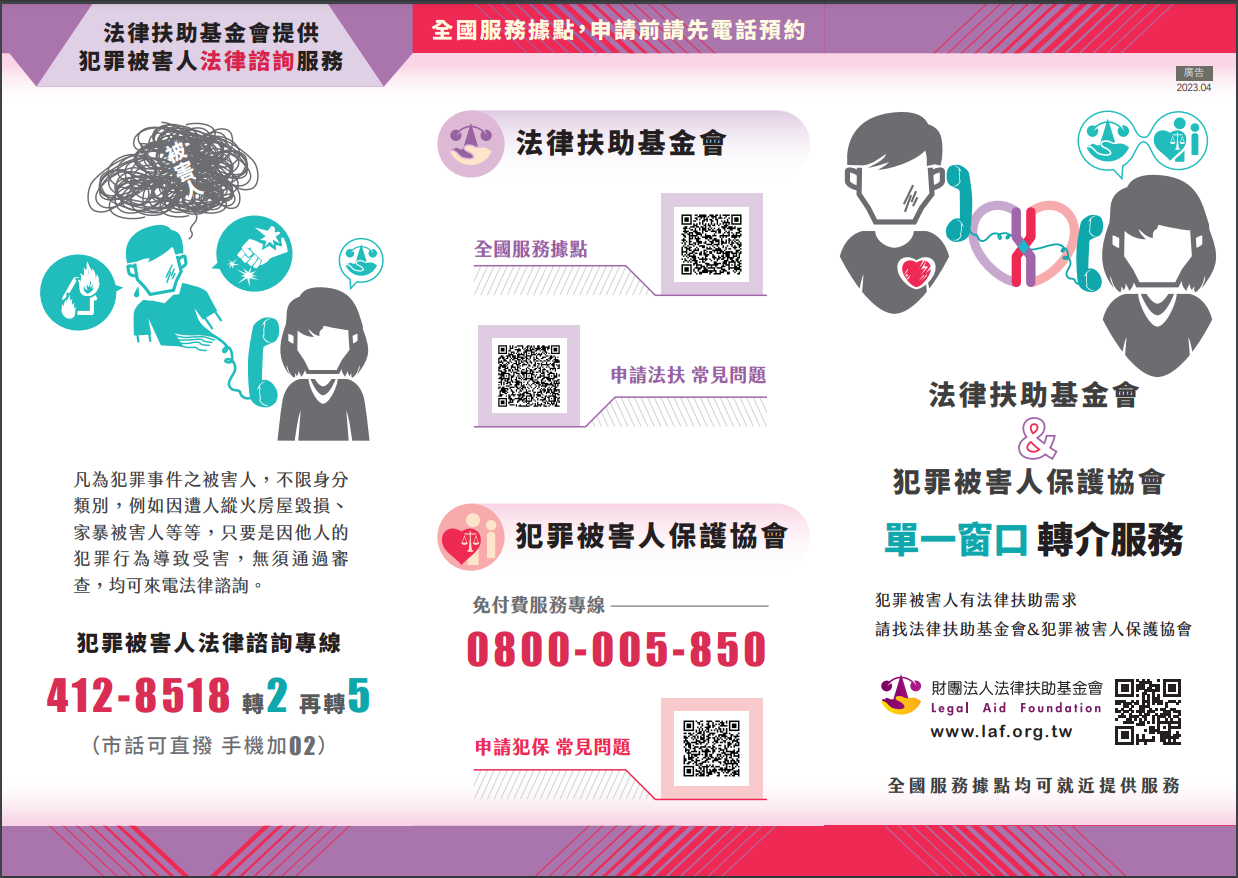 相關宣導素材亦將持續更新於財團法人犯罪被害人保護協會網站(https://www.avs.org.tw/)「暖心出品」項下之「馨希望電子報」、「文宣刊物」、「影音平台」與「保護週」頁面,及該會粉絲專頁(https://www.facebook.com/avs0850?locale=zh_TW)。