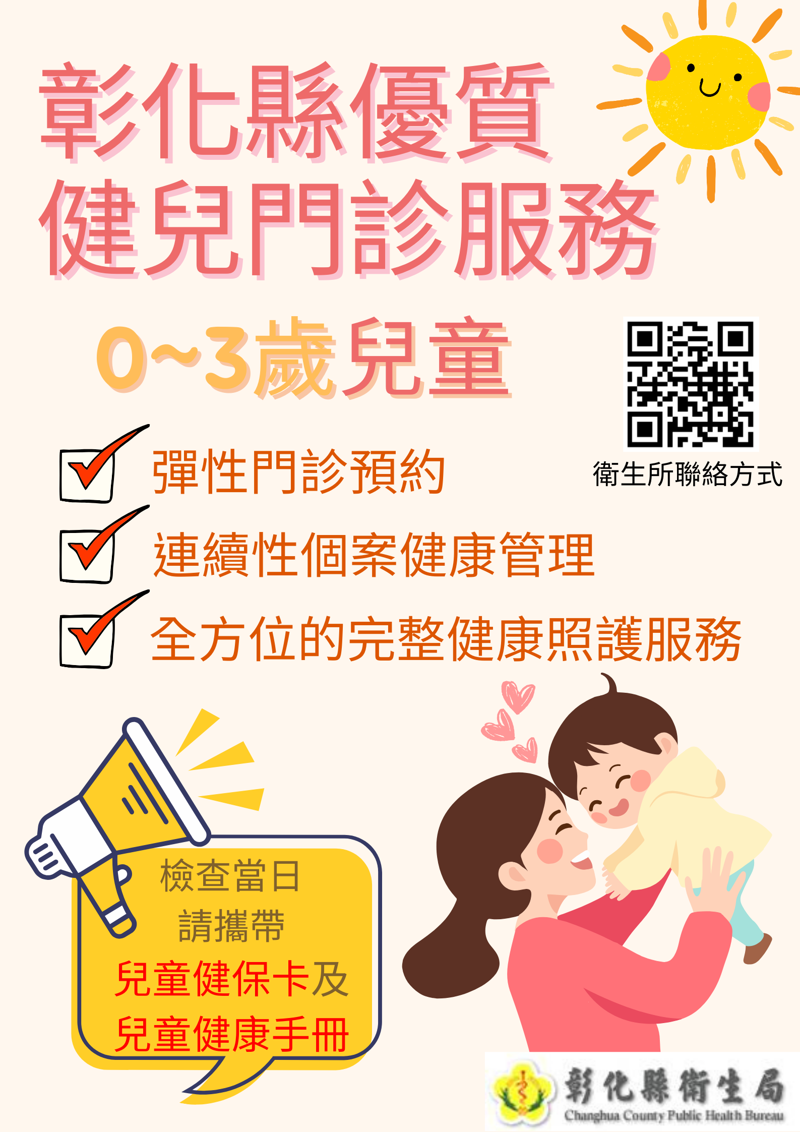 ⭐️透過門診預約,以「個案健康管理」的方式,推動轄內0~3歲兒童持續性、完整性及全方位的健康照護服務。 ⭐️可早期發現潛在性的健康問題,協助轉介就醫,早發現,早療育 ⭐️檢查當天請攜帶兒童健保卡、兒童健康手冊。 彰化縣衛生局關心您