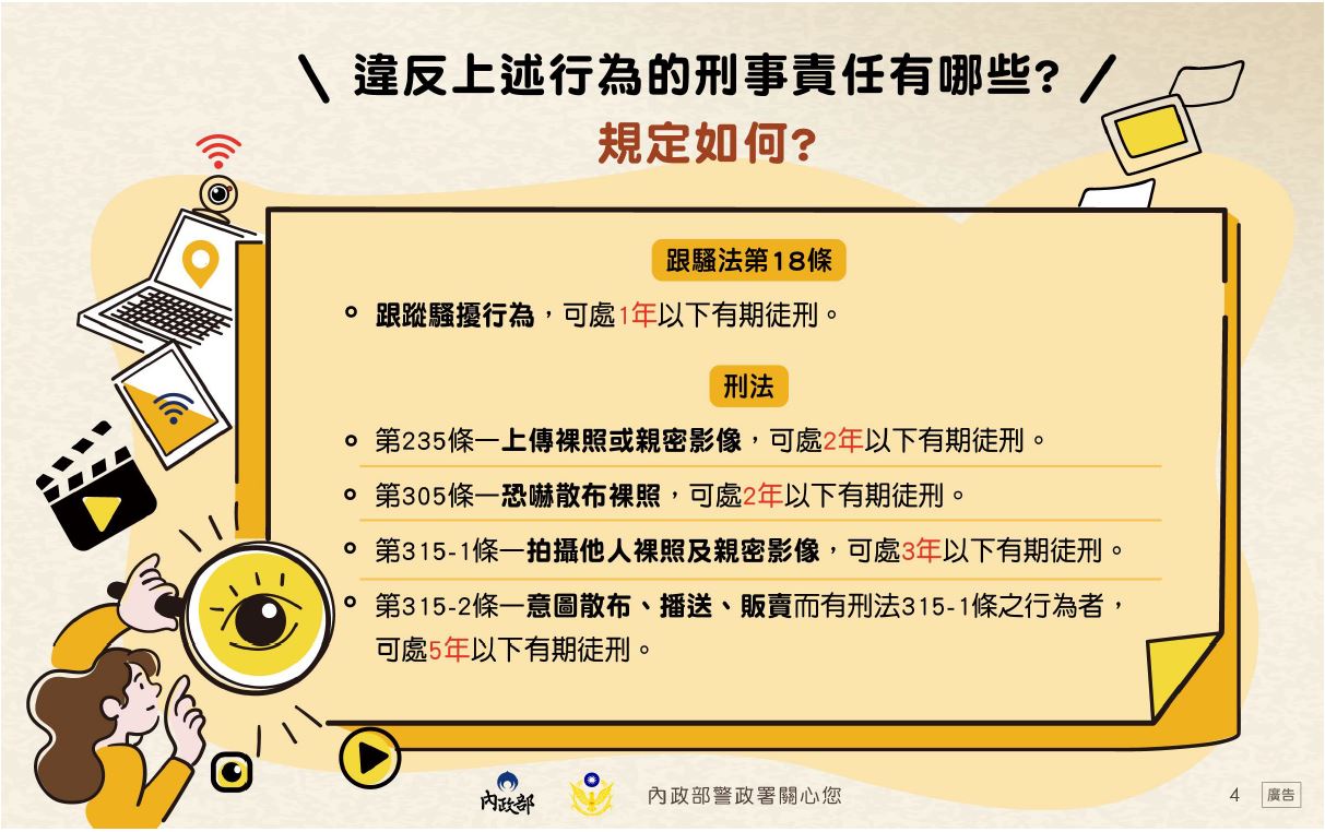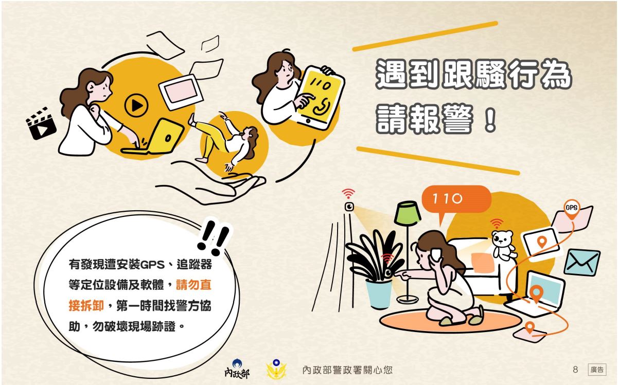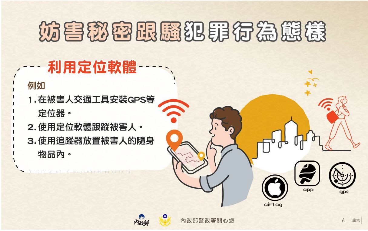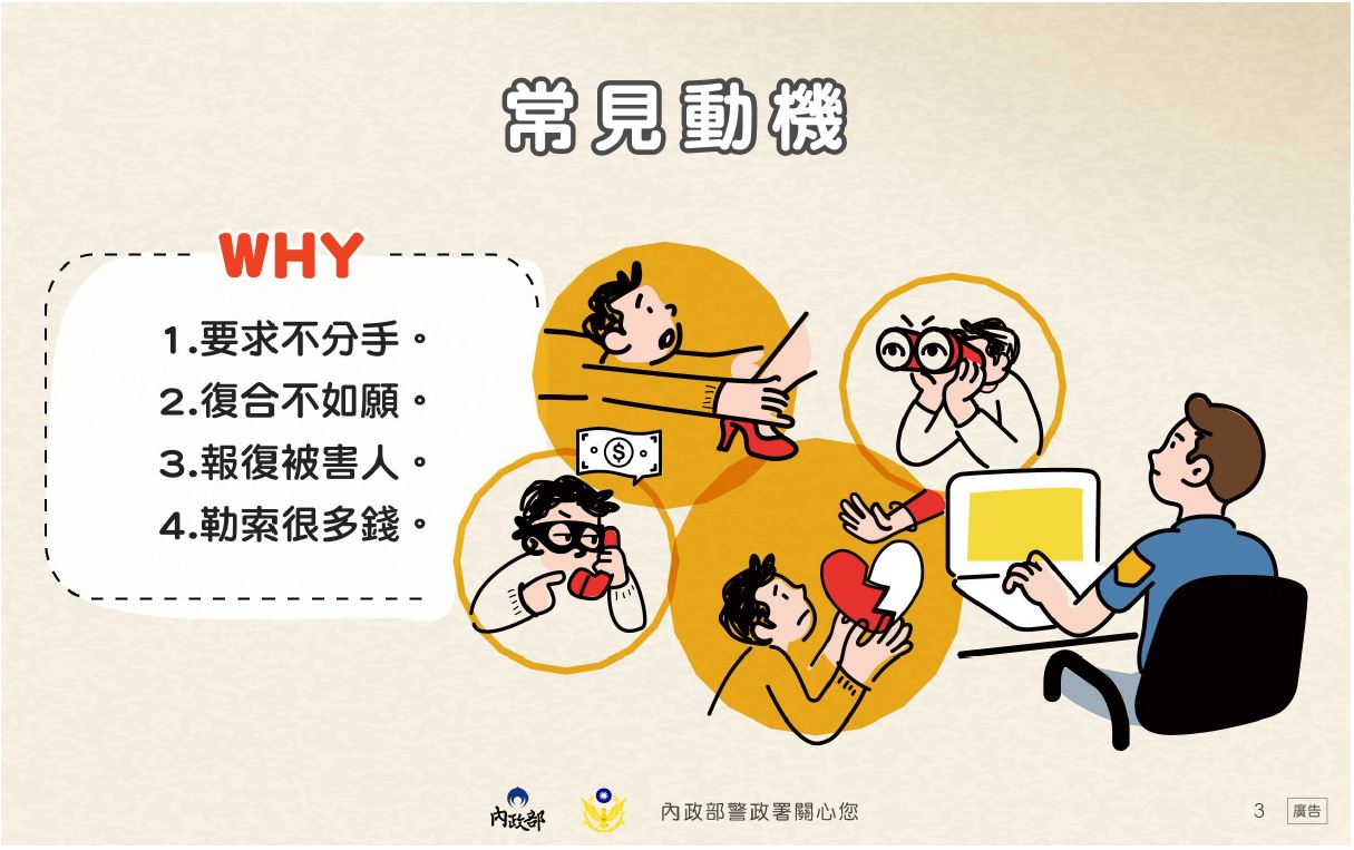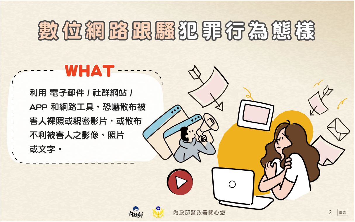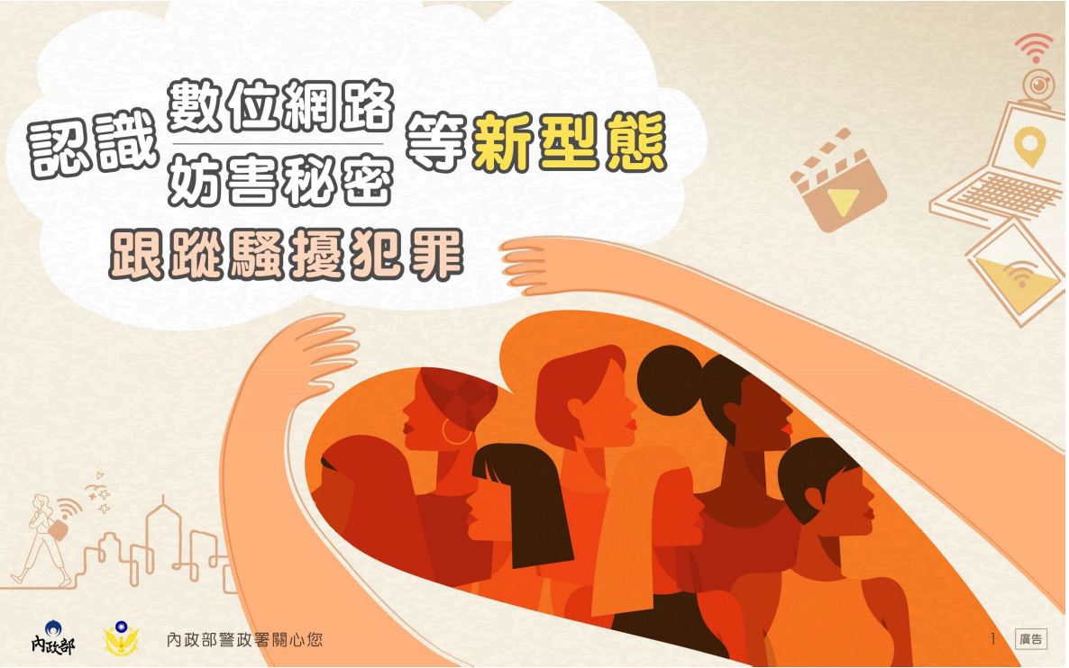 鑒於數位性別暴力事件日益增多,且不乏使用網路實施跟蹤騷擾行為(例如利用電子郵件、社群網站等網路工具,威脅散布被害人裸照或親密影片等,內政部警政署設計「認識數位網路/妨害秘密等新型態跟蹤騷擾犯罪」宣導懶人包。