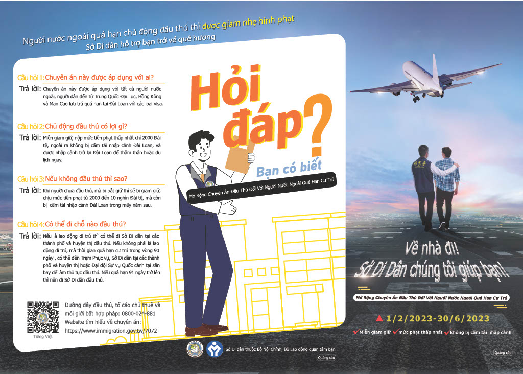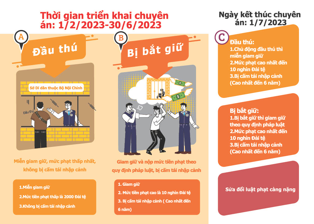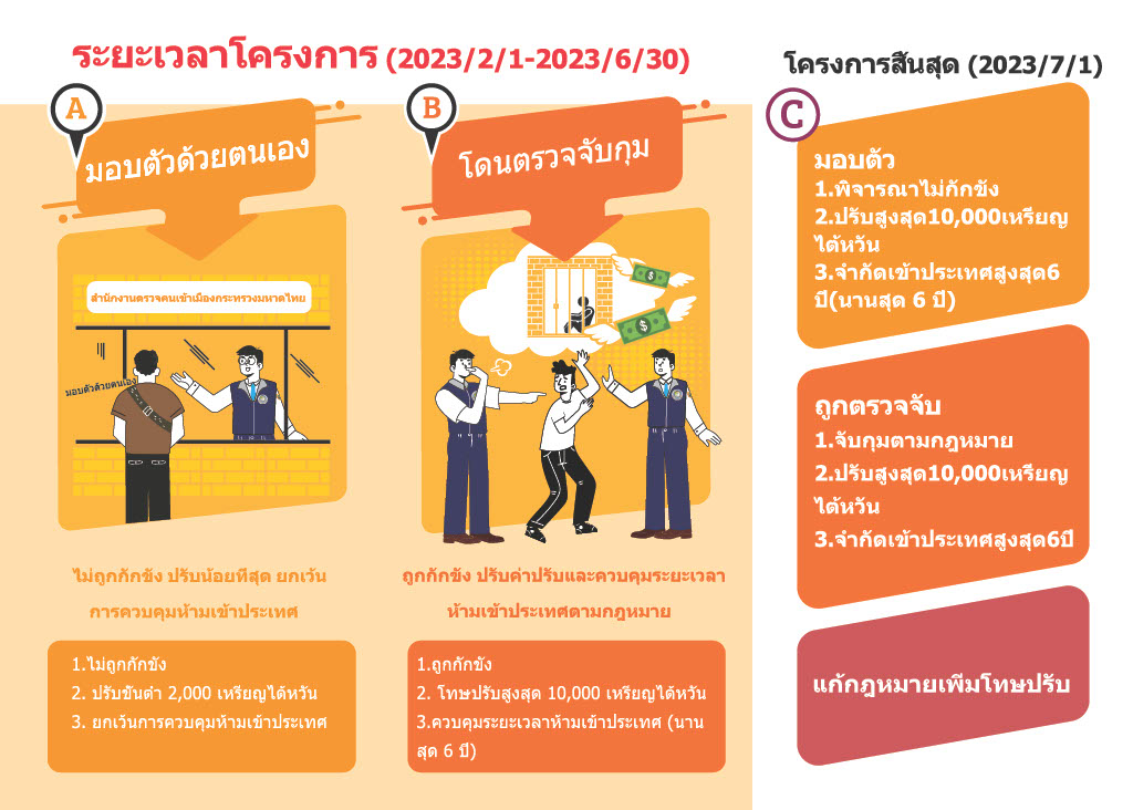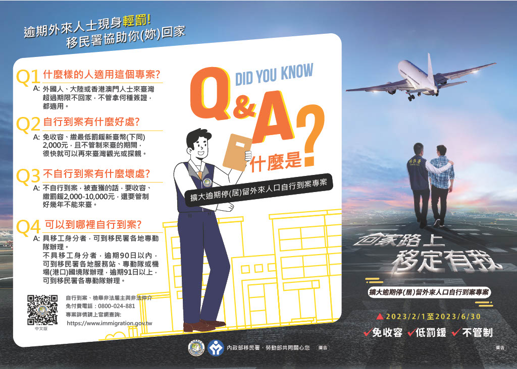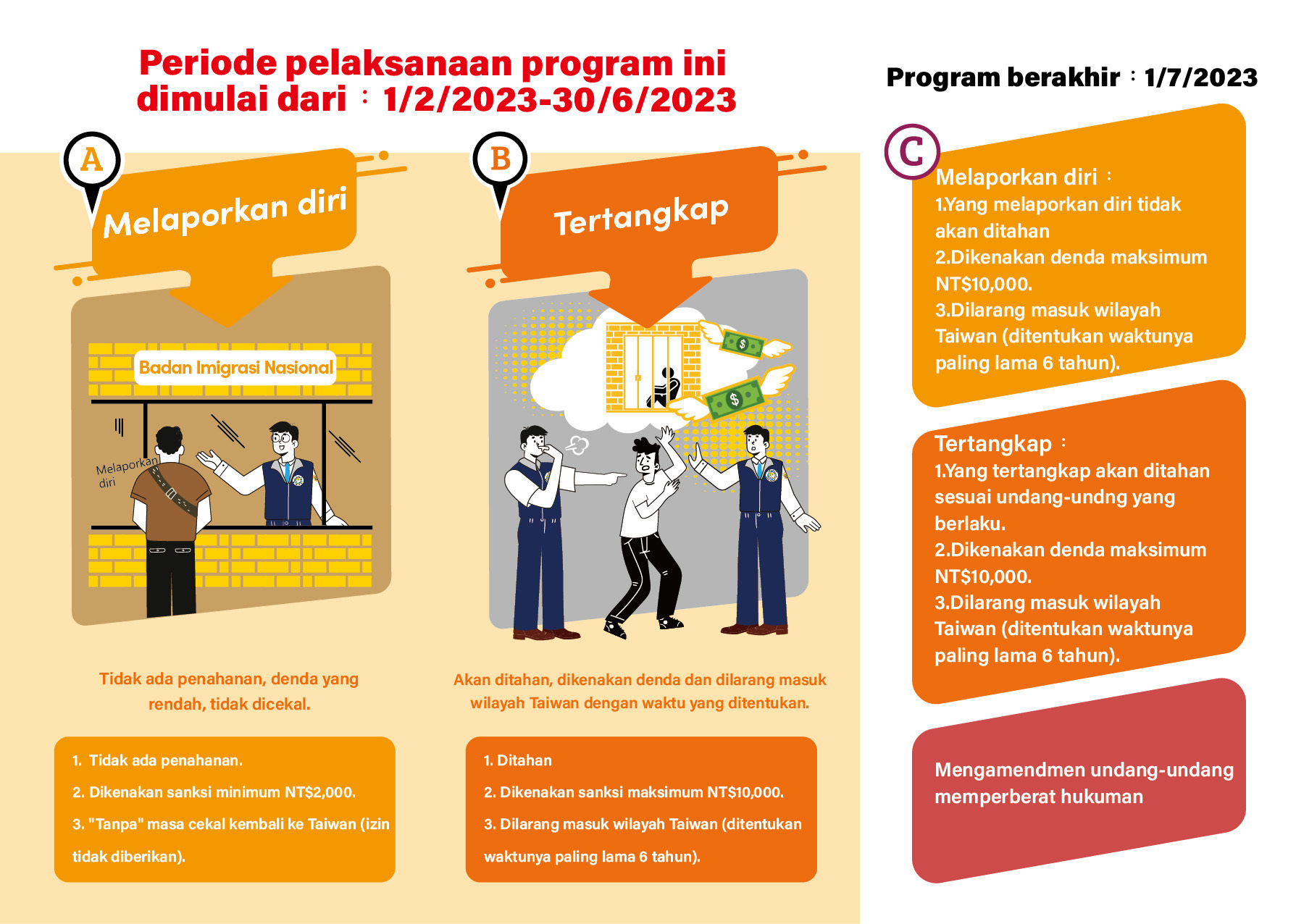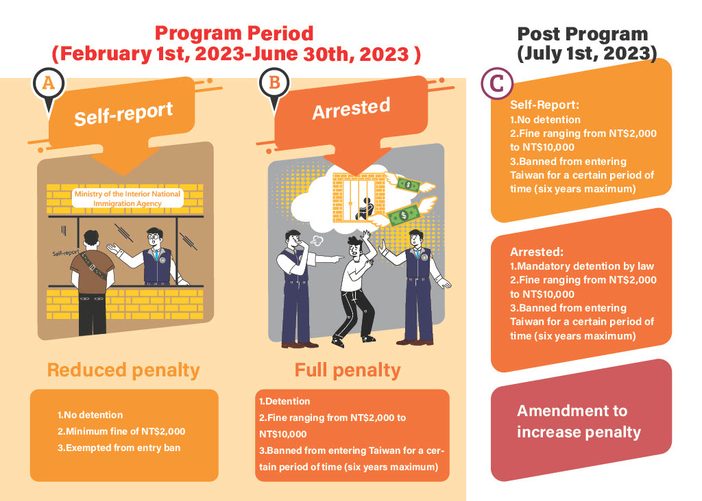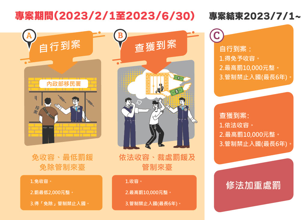 (一)專案實施期間「自行到案」者:免予收容、處最低罰鍰(新臺幣2,000元)及免除禁止入國不予許可期間。
