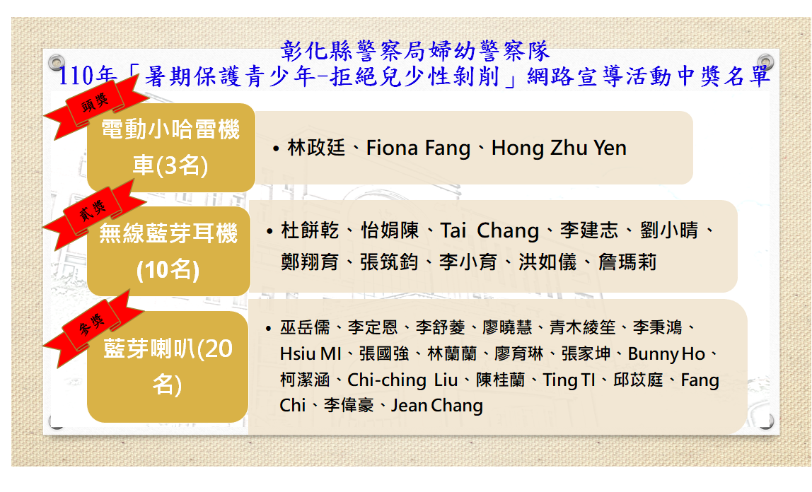 110年「暑期保護青少年-拒絕兒少性剝削」網路宣導活動得獎者名單出爐 小編恭喜各位幸運得獎粉絲!