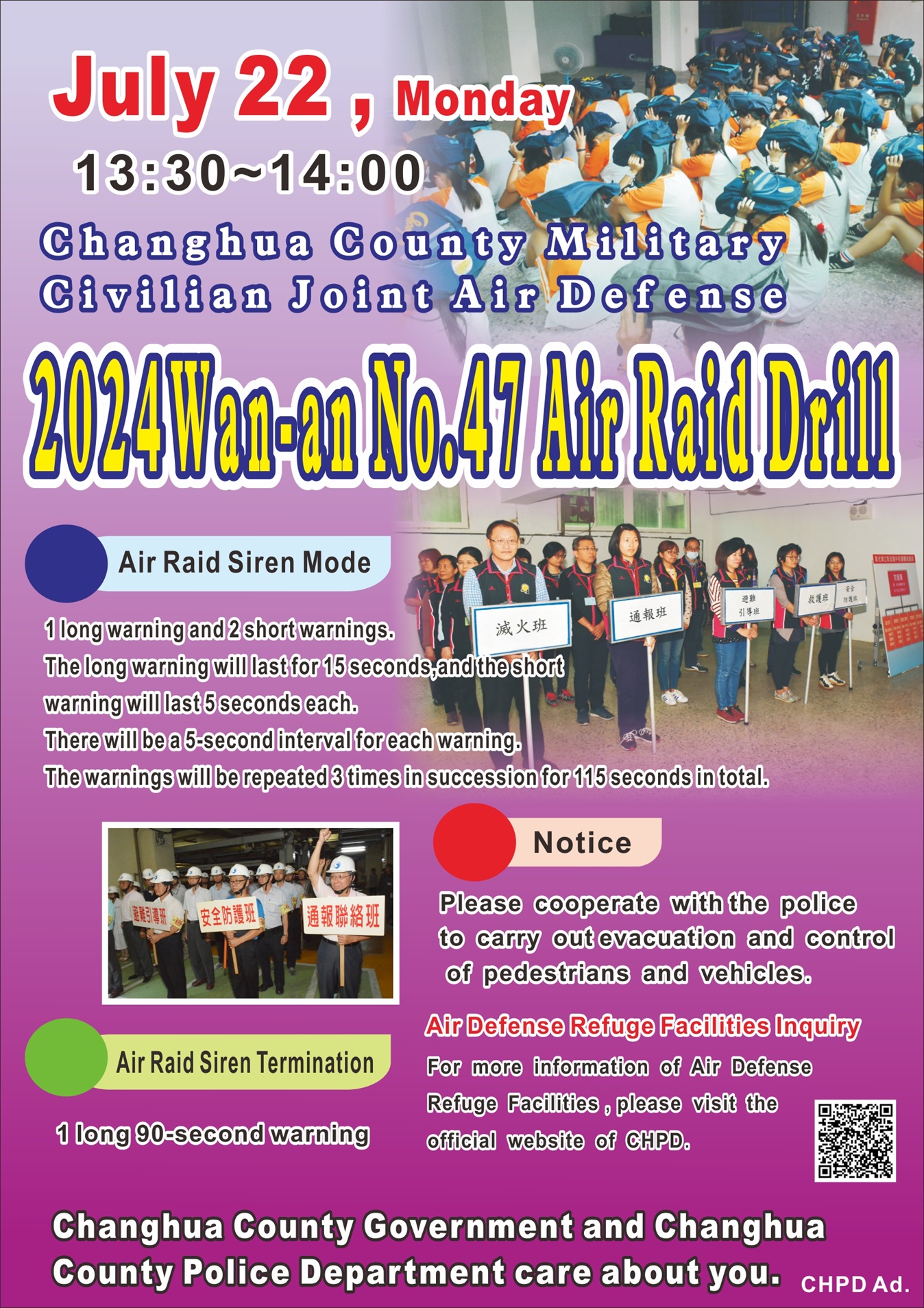 Changhua County 2024 Joint Civil-Military Air-Raid Exercise (NO.47 Wan An Exercise) will take place from 1:30 p.m. to 2 p.m. on July 22. The transmission and issuance of air defense warning, pedestrians and cars evacuation, traffic control, and other necessary controls will be implemented during this exercise. From 2 p.m. to 2:30 p.m. (following the air defense alert is lifted), there will be the wartime rescue and establishment exercise for establishing civilian shelters.