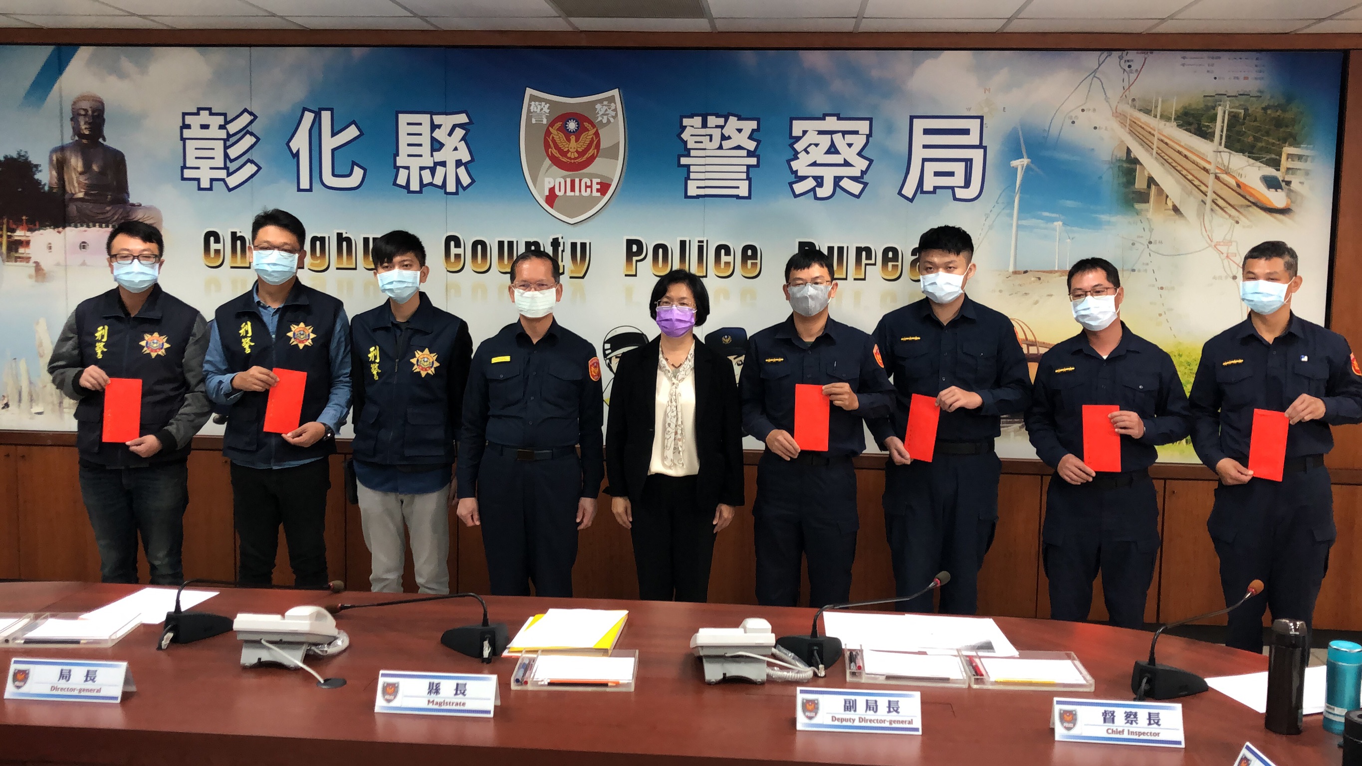 CHPD used the ways of criminal cases investigation and multiple detecting skills to find the missing persons one after another. Magistrate Wang, Hui-Mei specially awarded CHPD and other 6 police officers and bank clerks for contributions to the guns, drug, and the fraud cases solving.