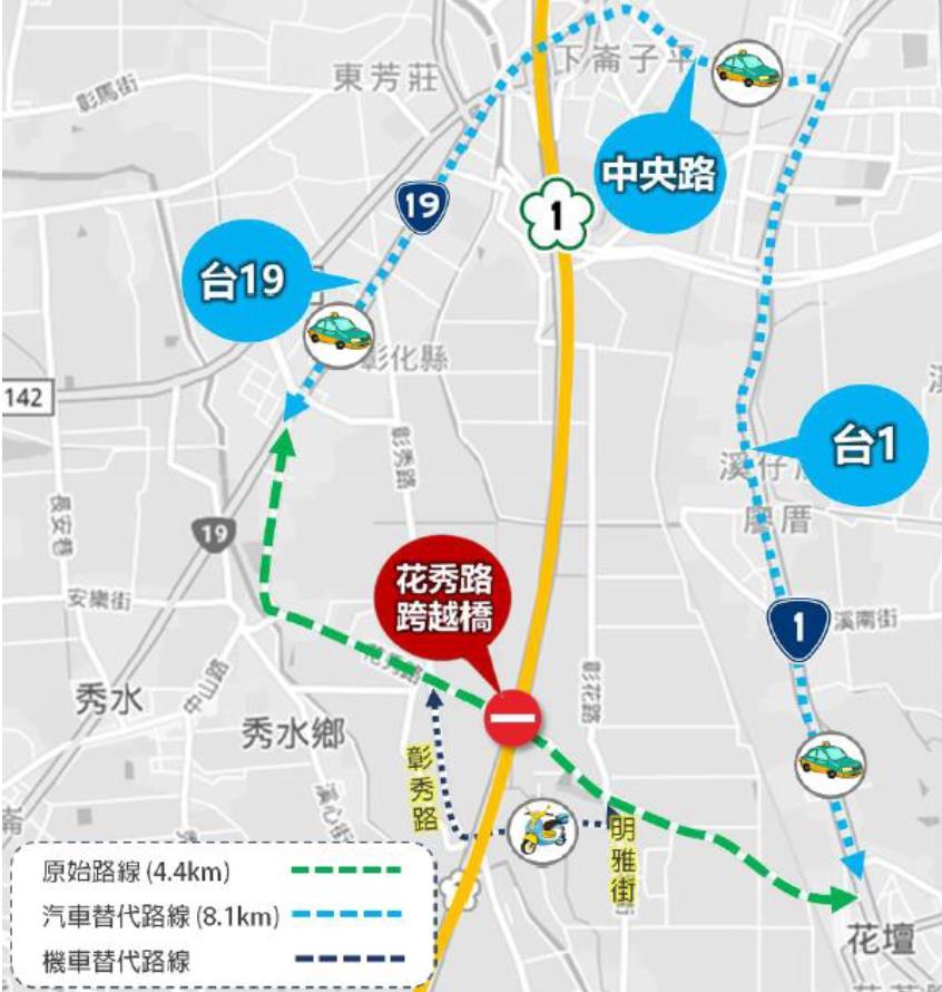 連接花壇鄉至秀水鄉的花秀路跨越橋,自110年8月2日起為配合國道1號施工封閉,預計封閉至明年111年7月31日。