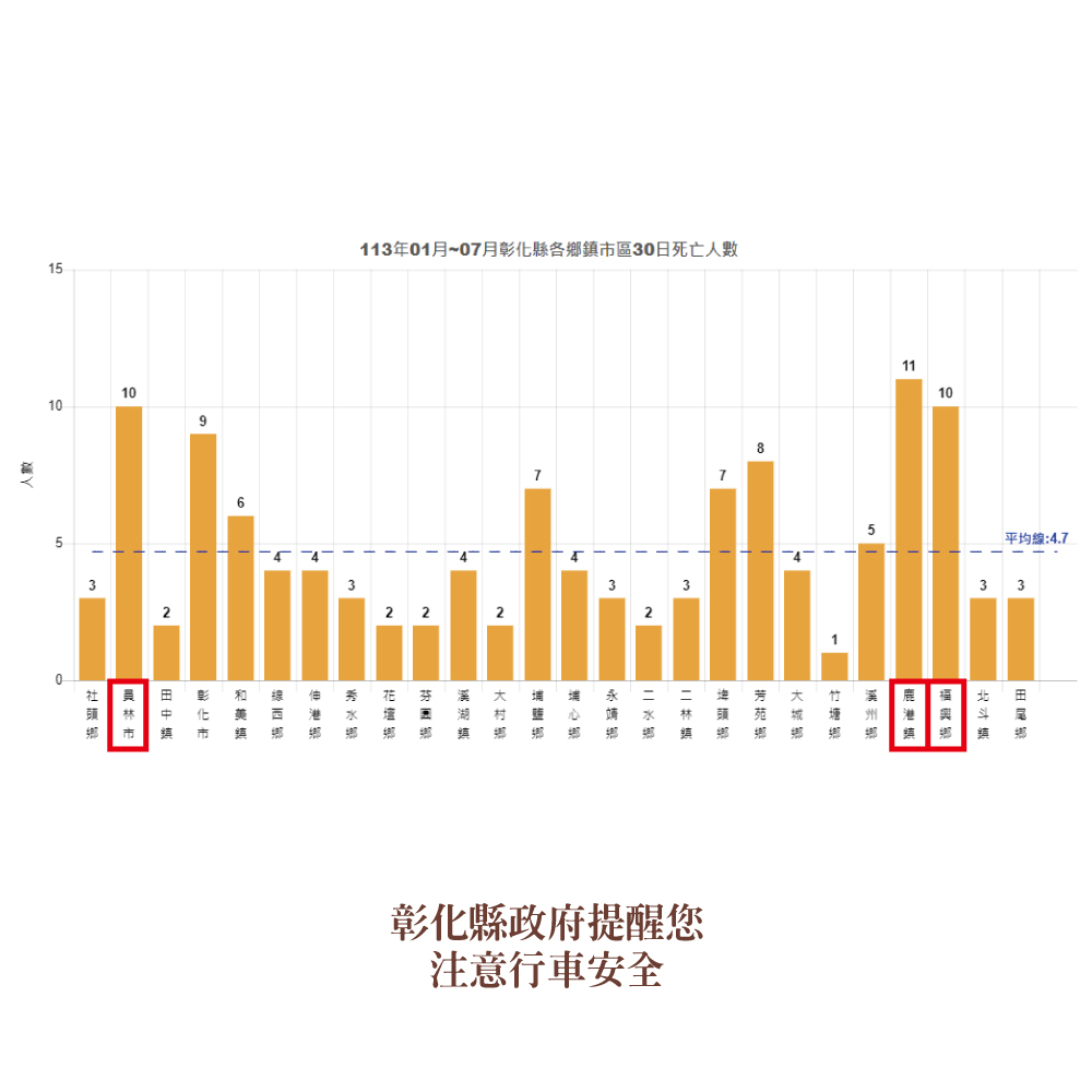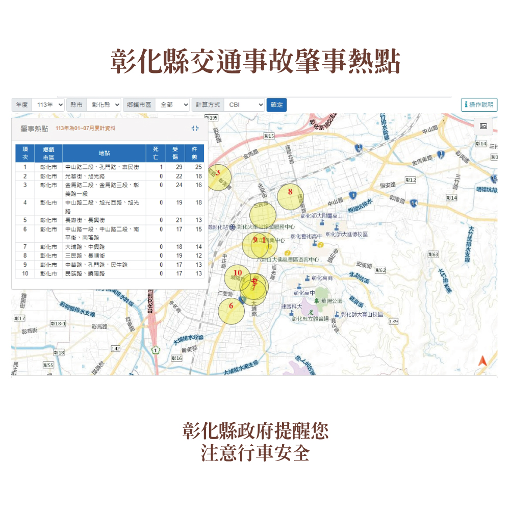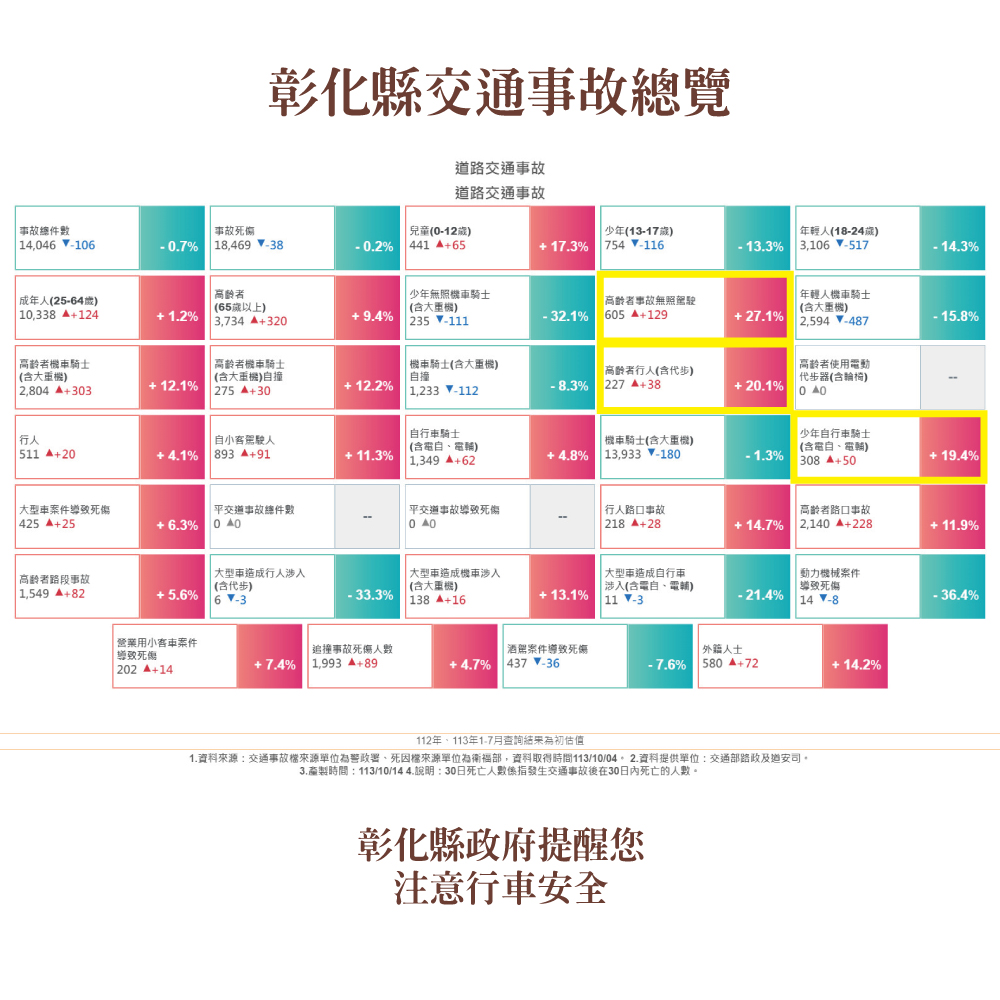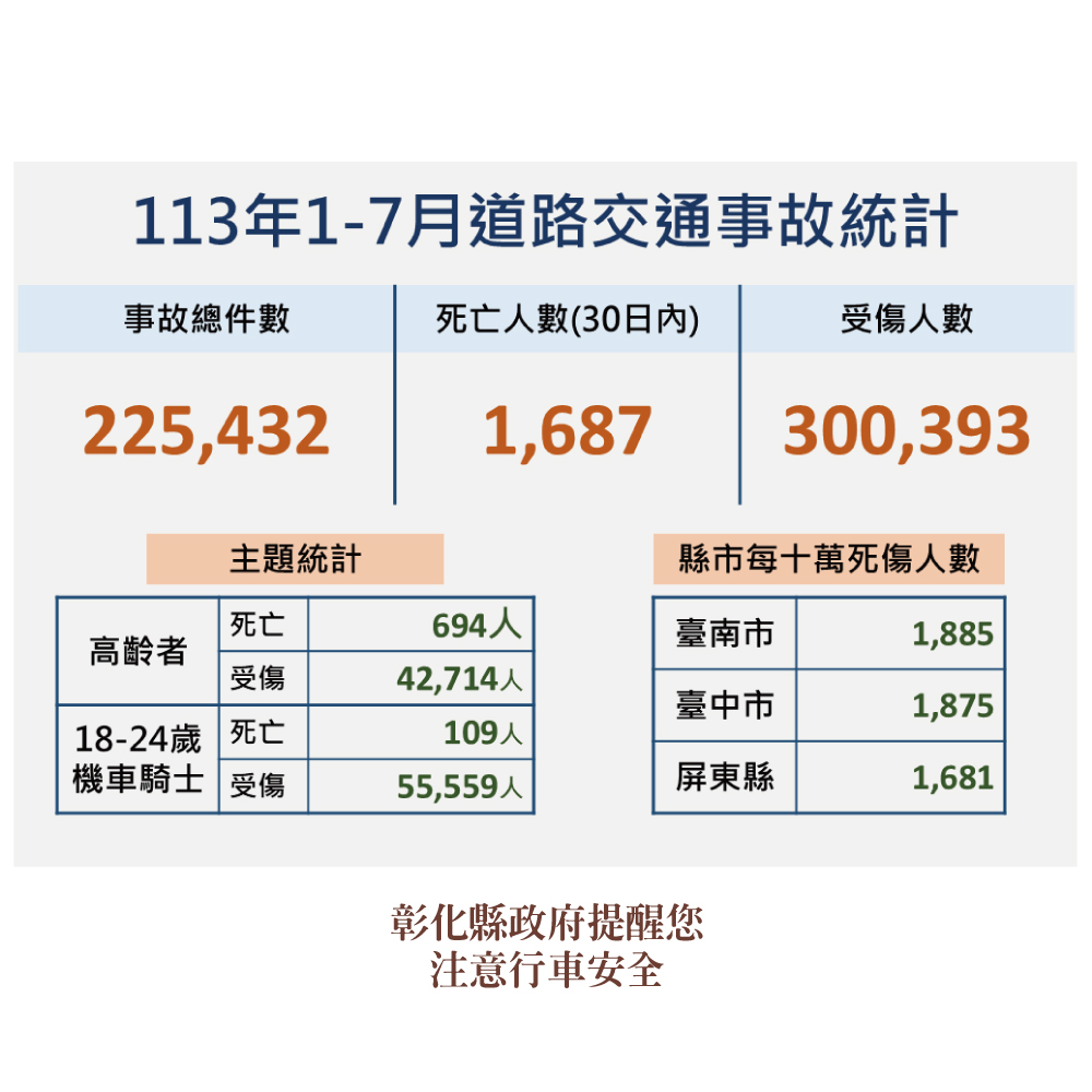 113年7月道路交通事故死傷累計18,469人,高齡定期換駕照,出入平安一把罩,彰化縣政府關心您。