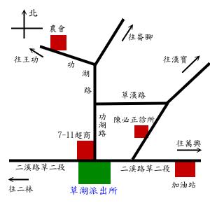 轄區概況 草湖派出所所長陳泰郎,聯絡電話04-8862438, 轄區負責新生村、崙腳村、建平村、草湖村、文津村之治安維護工作,規劃為7個警勤區, 主管1名 、副主管1名、警勤區7名、支援警力2名, 電子郵件帳號b272@ms1.chpb.gov.tw 交通方式: 開車: 員林交流道(溪湖)→員鹿路1段→員鹿路2段→二溪路1段→二溪路2段→左轉二溪路→二溪路7段→二溪路6段→右轉中央街→左轉二溪六段→二溪路→草湖派出所