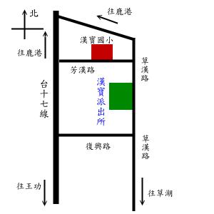 轄區概況 漢寶派出所所長許永堂,聯絡電話04-8991219, 轄區負責漢寶村之治安維護,規劃3個警勤區, 主管 、副主管各1名、警勤區3名、支援7名, 電子郵件帳號a5473@ms1.chpb.gov.tw 交通方式: 開車: 福興交流道(秀水/溪湖)→員林大排平面道路→左轉社尾街→右轉員鹿路一段→左轉秀安二街→左轉沿海路4段→沿海路3段→沿海路2段→沿海路1段→左轉草漢路→漢寶派出所