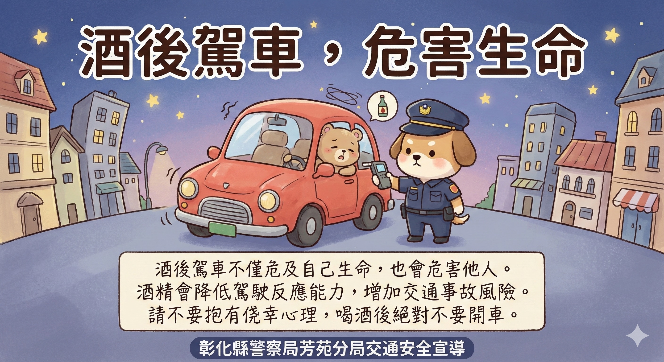酒後駕車不僅危及自己生命,也會危害他人。酒精會降低駕駛反應能力,增加交通事故風險。請不要抱有侥幸心理,喝酒後絕對不要開車。