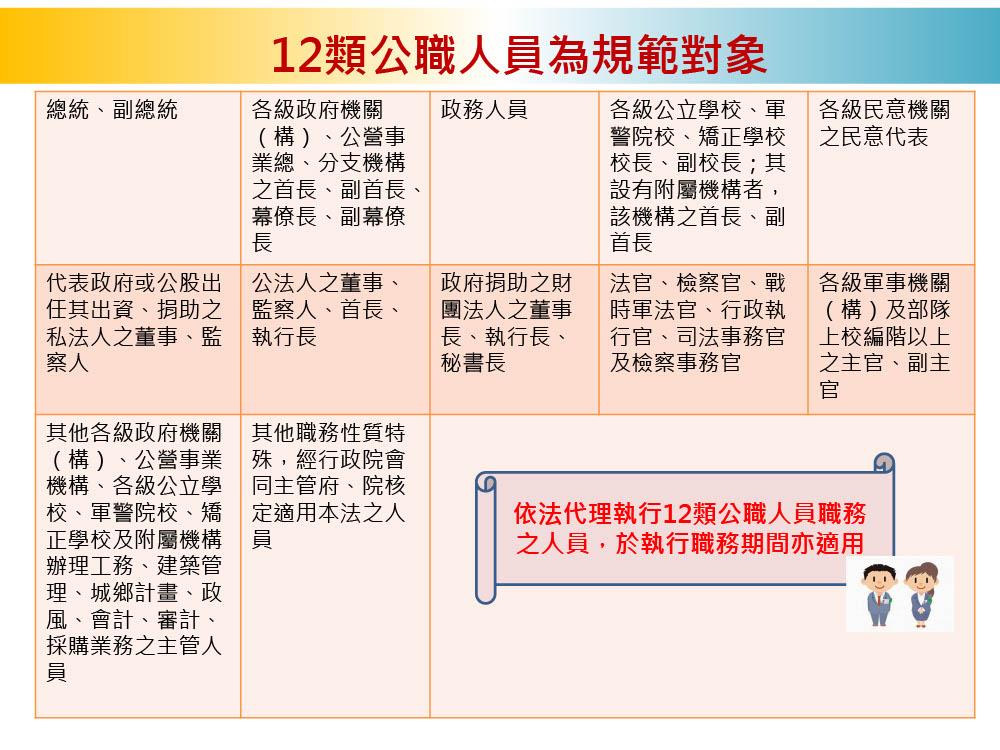 公職人員利益衝突迴避法主要是要求公職人員執行職務遇到有利益衝突的情形時,減少執行職務時公器私用或者是利益輸送的機會。