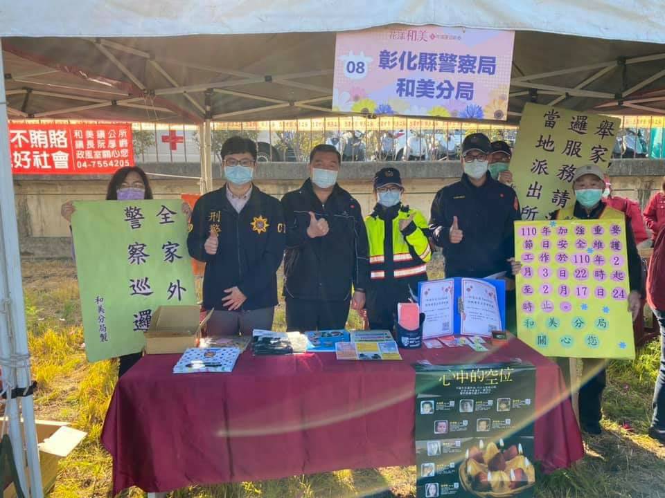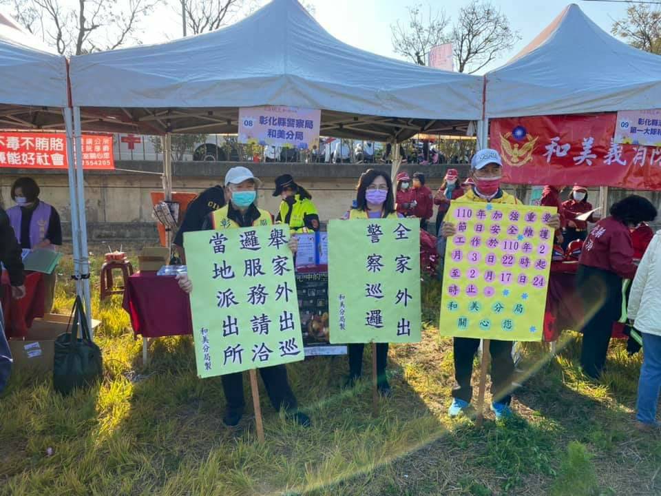 為了讓活動更順遂進行,和美分局派遣警力6人及民力(民防3名、義警3名)至活動現場進行交通疏導與安全維護,活動會場設置機動派出所提供民眾諮詢服務,並設立行動補給站提供員警及協勤民力適時調節體力。針對110年加強重要節日安全維護工作宣導項目,和美分局派員於會場內設立攤位,向民眾宣導「協助民眾舉家外出安全維護」、「協助失蹤人口返家團圓」、「交通安全」、「防搶(竊)、防詐騙、反毒」等治安政策,希望鄉民在農曆春節能家家戶戶人員平安順遂,也能夠了解我們和美分局的用心。