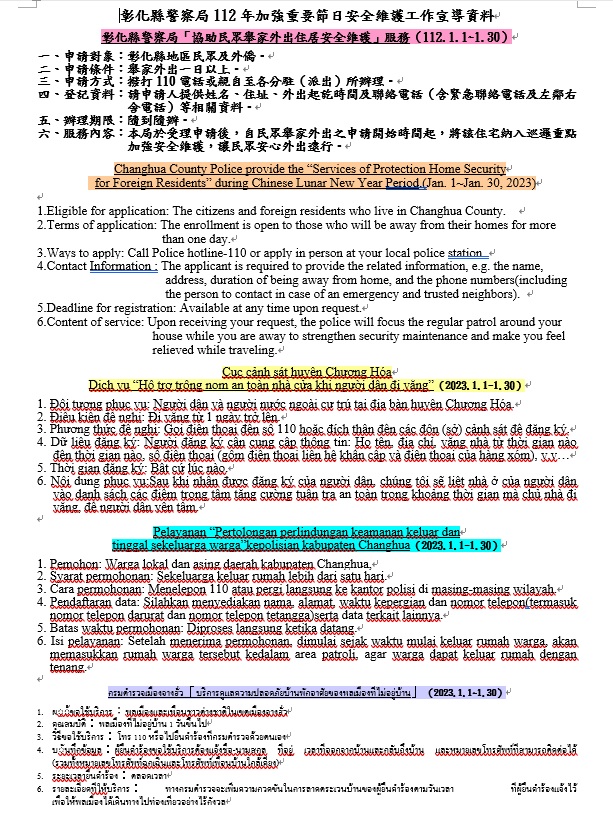農曆春節將屆,此期間是民眾返鄉探親或外出渡假旅遊最佳時機,也易遭到宵小覬覦趁虛而入,為預防民眾住宅遭不法侵入,和美分局持續推動「協助民眾(含外僑)舉家外出住居安全維護」服務工作,轄內民眾或在臺外國朋友如有較長時間外出或渡假,擔心居家安危,可以向當地警察機關申請加強住宅巡邏服務,警察會派員到住宅附近加強巡邏,讓民眾在春節期間,能夠安心外出遠行,歡喜過新年。