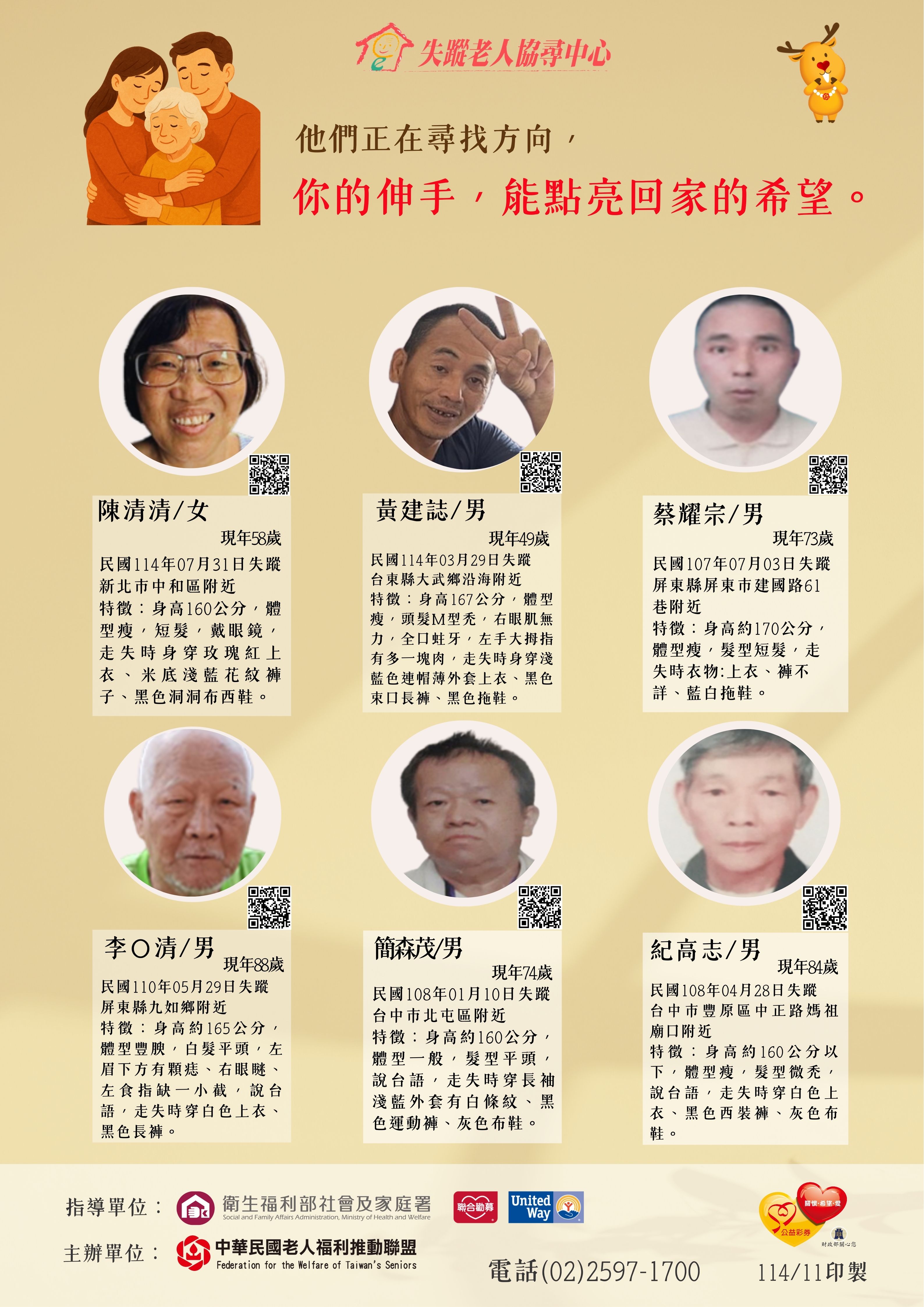 中華民國老人福利推動聯盟辦理「失蹤老人協尋中心」之第137批協尋海報