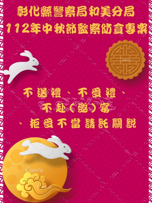 本分局辦理112年中秋節監察防貪專案,自112年9月17日起至10月1日止,分局各單位不送禮、不受禮、不邀宴、不赴宴,拒絕不當受贈財物、宴飲應酬、請託關說等陋習,防制弊端發生,落實執行監察防貪工作,以端正警察風紀,提升警察廉潔形象。