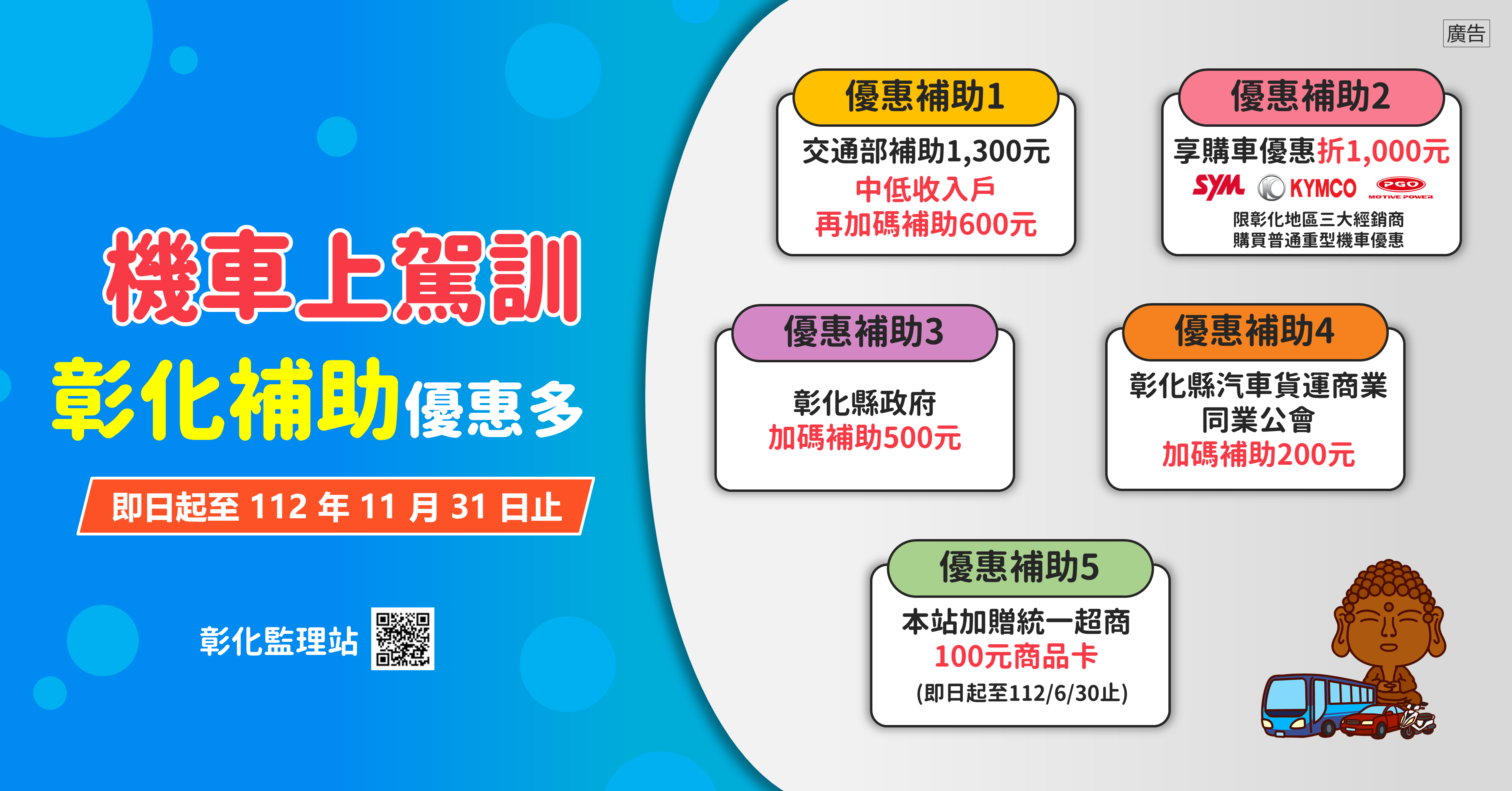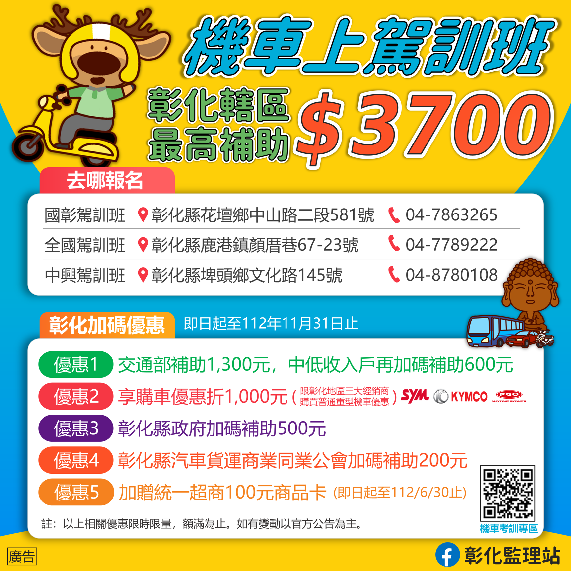 為鼓勵民眾到機車駕訓班,參加普通重型機車駕駛訓練後再考取駕照,彰化縣政府、三陽、光陽、摩特動力等經銷商、彰化縣汽車貨運商業同業公會及彰化轄區駕訓班,紛紛推出加碼優惠補助方案,優惠合計每人最高可申請補助3,700元,名額有限,敬請民眾把握。