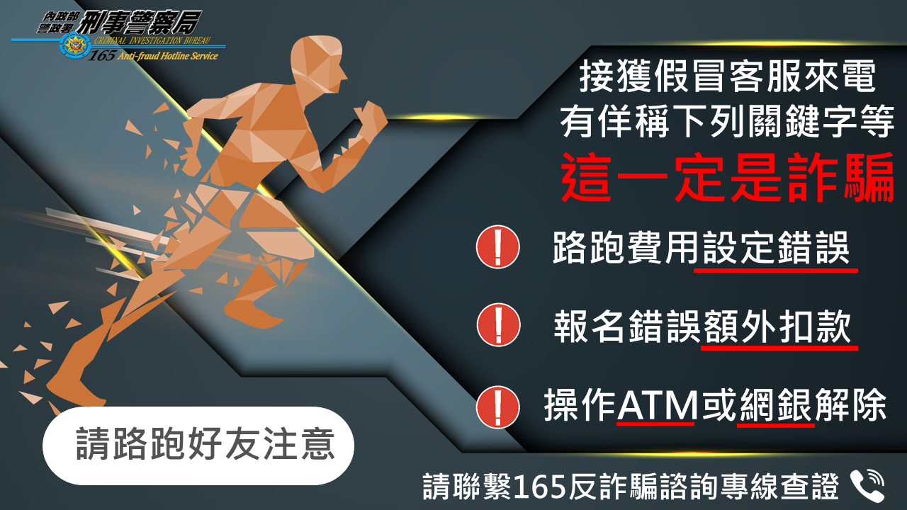 請各位喜愛路跑的跑友接到此類電話,立即掛斷與通報165~