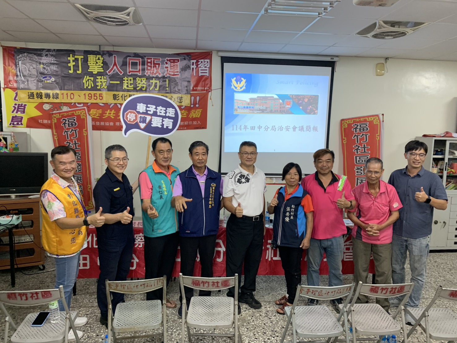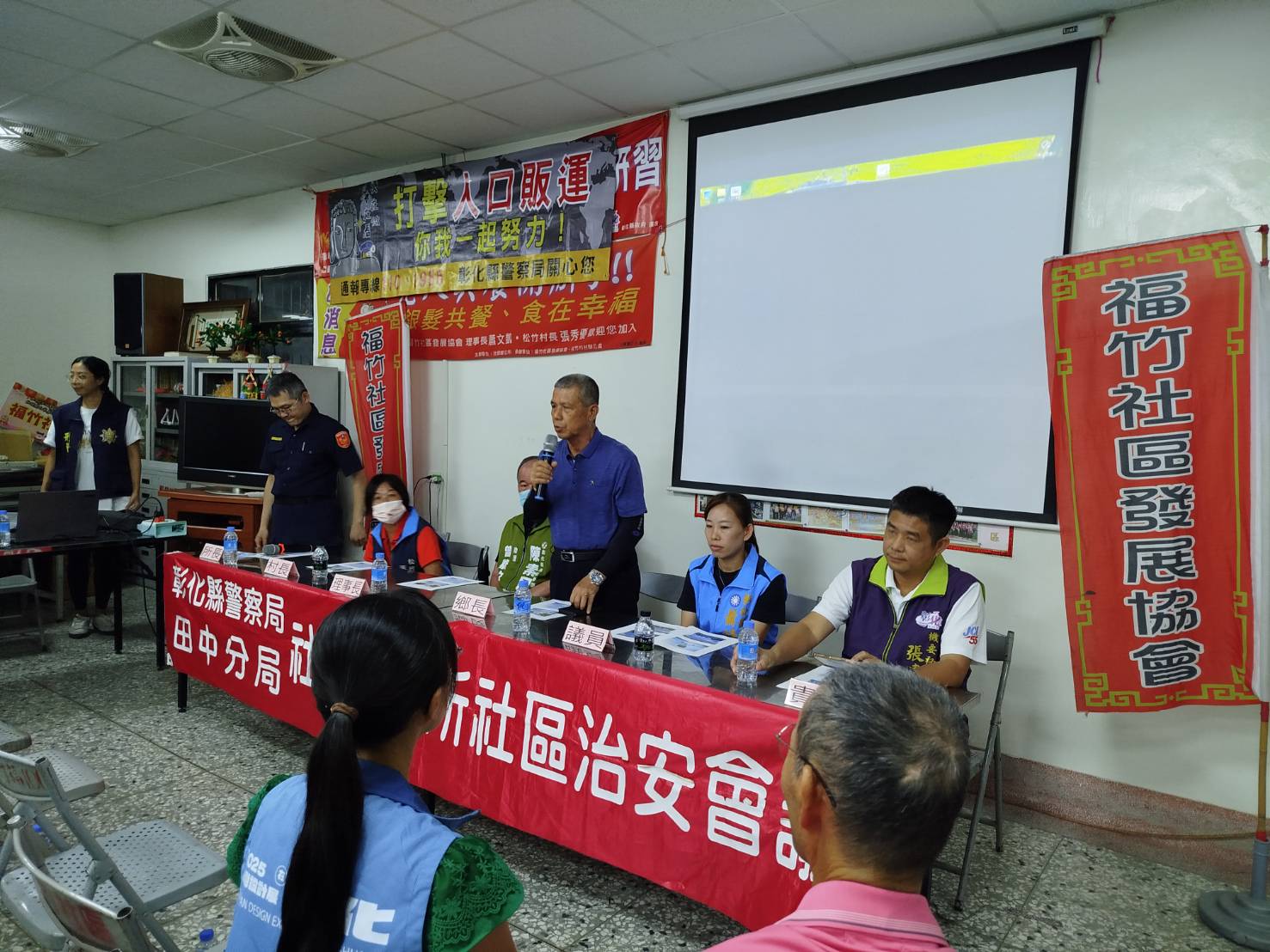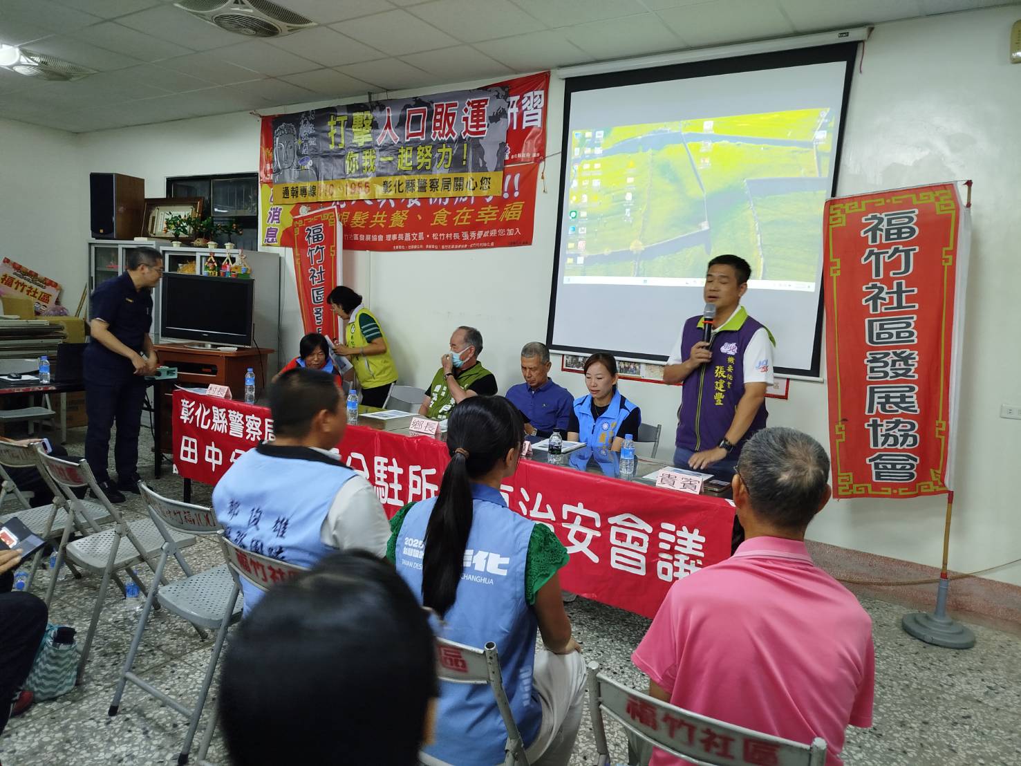 本分局社頭分駐所於8月19日19至21時,在彰化縣社頭鄉松竹村社區舉辦「社區治安會議」,由所長莊世煜主持,並由偵查隊、第三組、第五組及社頭消防分隊等單位到場宣導政令,灌輸治安現況、打詐儀錶板、詐騙案例、人口販運、交通安全及防災救災等知識技能,以落實「治安社區化」效能。除有彰化縣警察局防治科林宜萱股長、鄭閔育警務員、田中分局副分局長楊士漢及第三組組長蕭豐碧出席外,會中參加貴賓尚有議員蕭妤亘、議員詹琬惠、議員鄭俊雄助理蕭鈺霖、縣府機要秘書張建豐、縣府秘書蕭岳倫、縣政顧問莊詠晴、立委陳素月助理曾繁文、鄉長蕭俊二、村長張秀優、理事長蕭景泰、總幹事石錫惠等地方仕紳全程參與,參與民眾約50人,氣氛熱絡,會議進行順利。