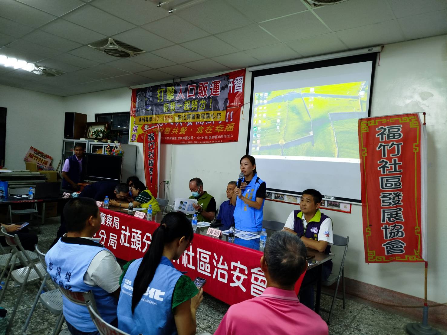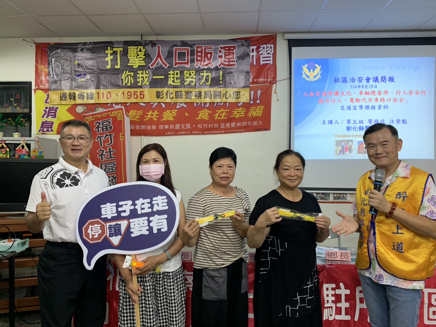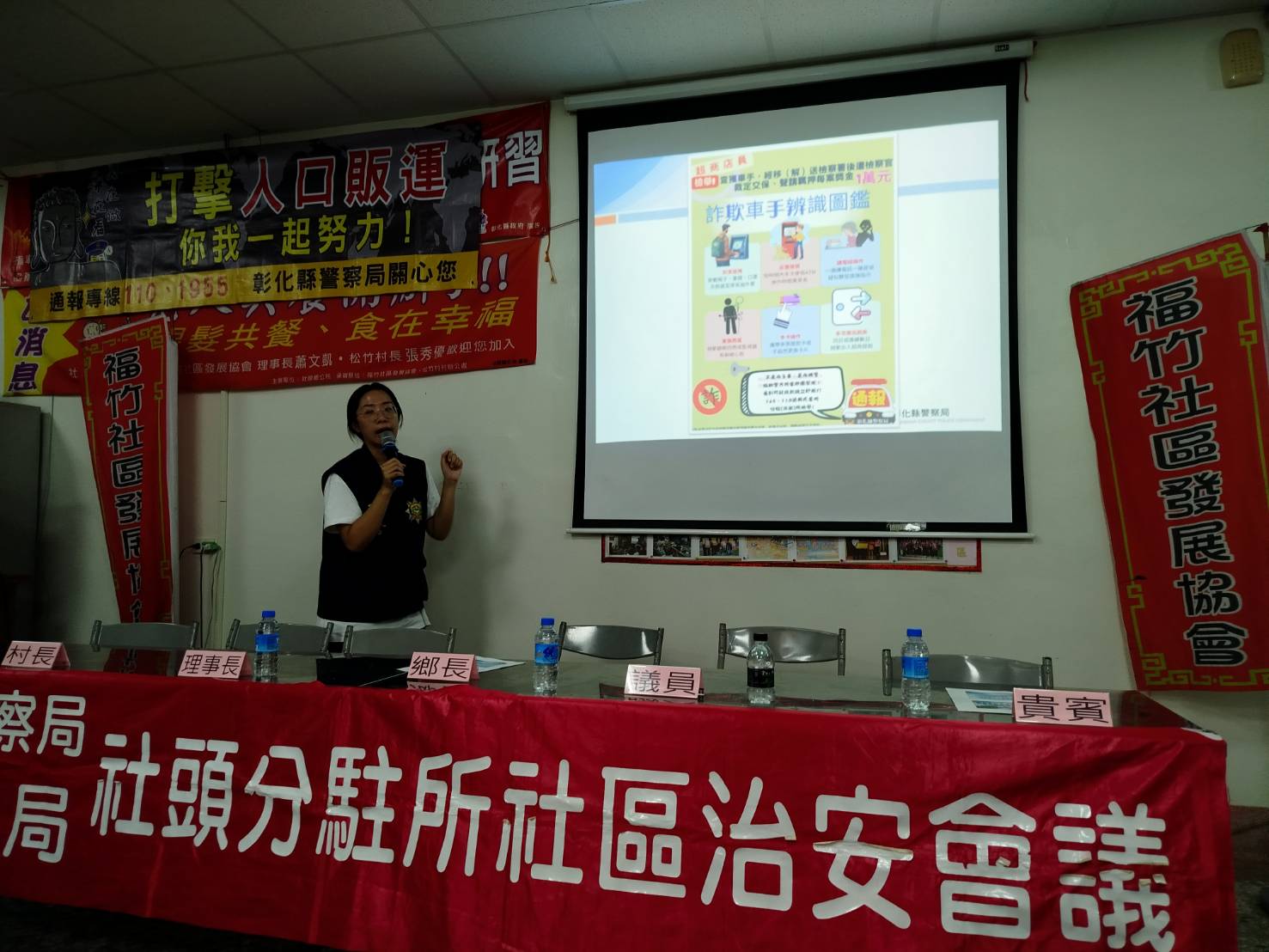 本分局社頭分駐所於8月19日19至21時,在彰化縣社頭鄉松竹村社區舉辦「社區治安會議」,由所長莊世煜主持,並由偵查隊、第三組、第五組及社頭消防分隊等單位到場宣導政令,灌輸治安現況、打詐儀錶板、詐騙案例、人口販運、交通安全及防災救災等知識技能,以落實「治安社區化」效能。除有彰化縣警察局防治科林宜萱股長、鄭閔育警務員、田中分局副分局長楊士漢及第三組組長蕭豐碧出席外,會中參加貴賓尚有議員蕭妤亘、議員詹琬惠、議員鄭俊雄助理蕭鈺霖、縣府機要秘書張建豐、縣府秘書蕭岳倫、縣政顧問莊詠晴、立委陳素月助理曾繁文、鄉長蕭俊二、村長張秀優、理事長蕭景泰、總幹事石錫惠等地方仕紳全程參與,參與民眾約50人,氣氛熱絡,會議進行順利。
