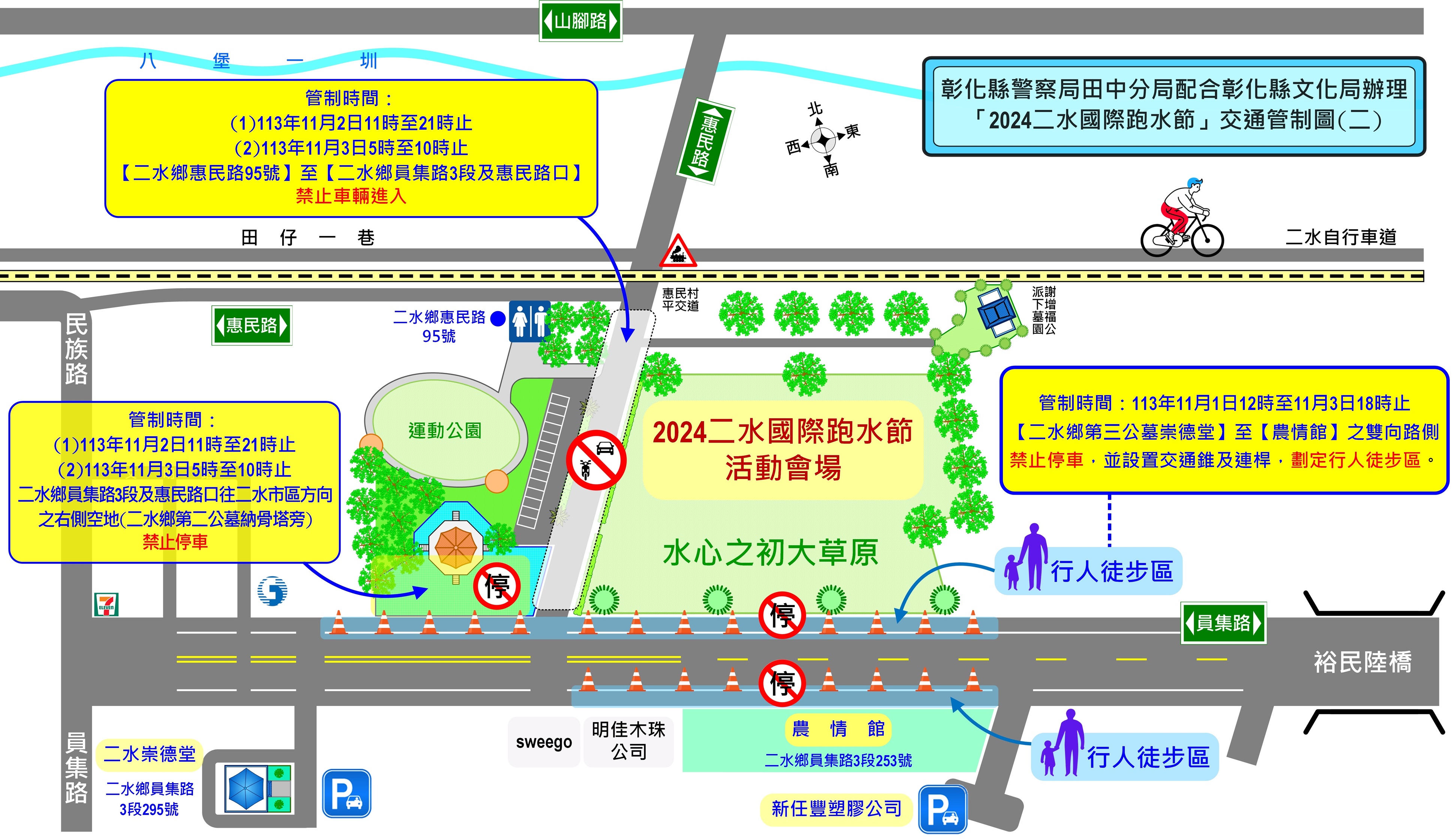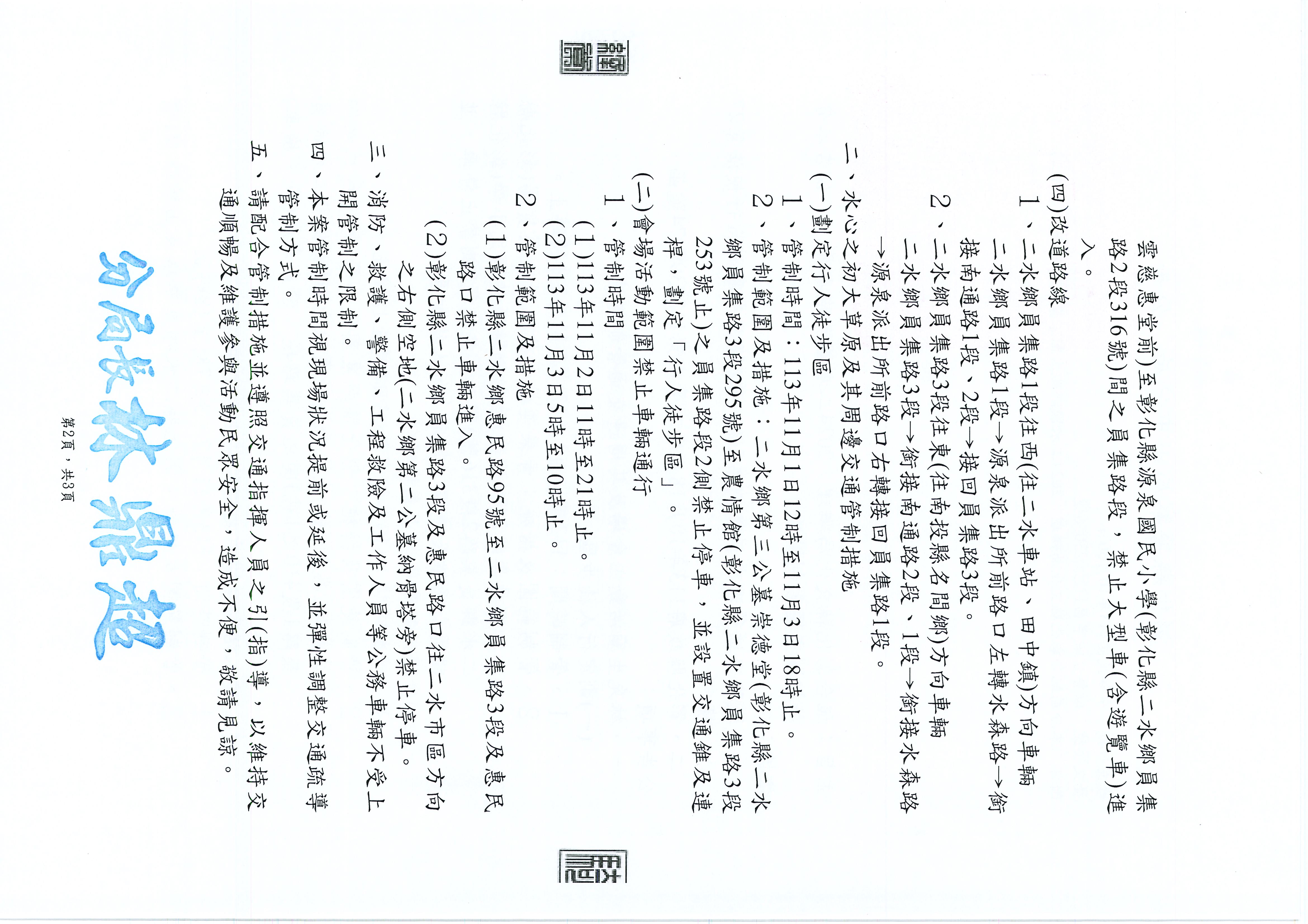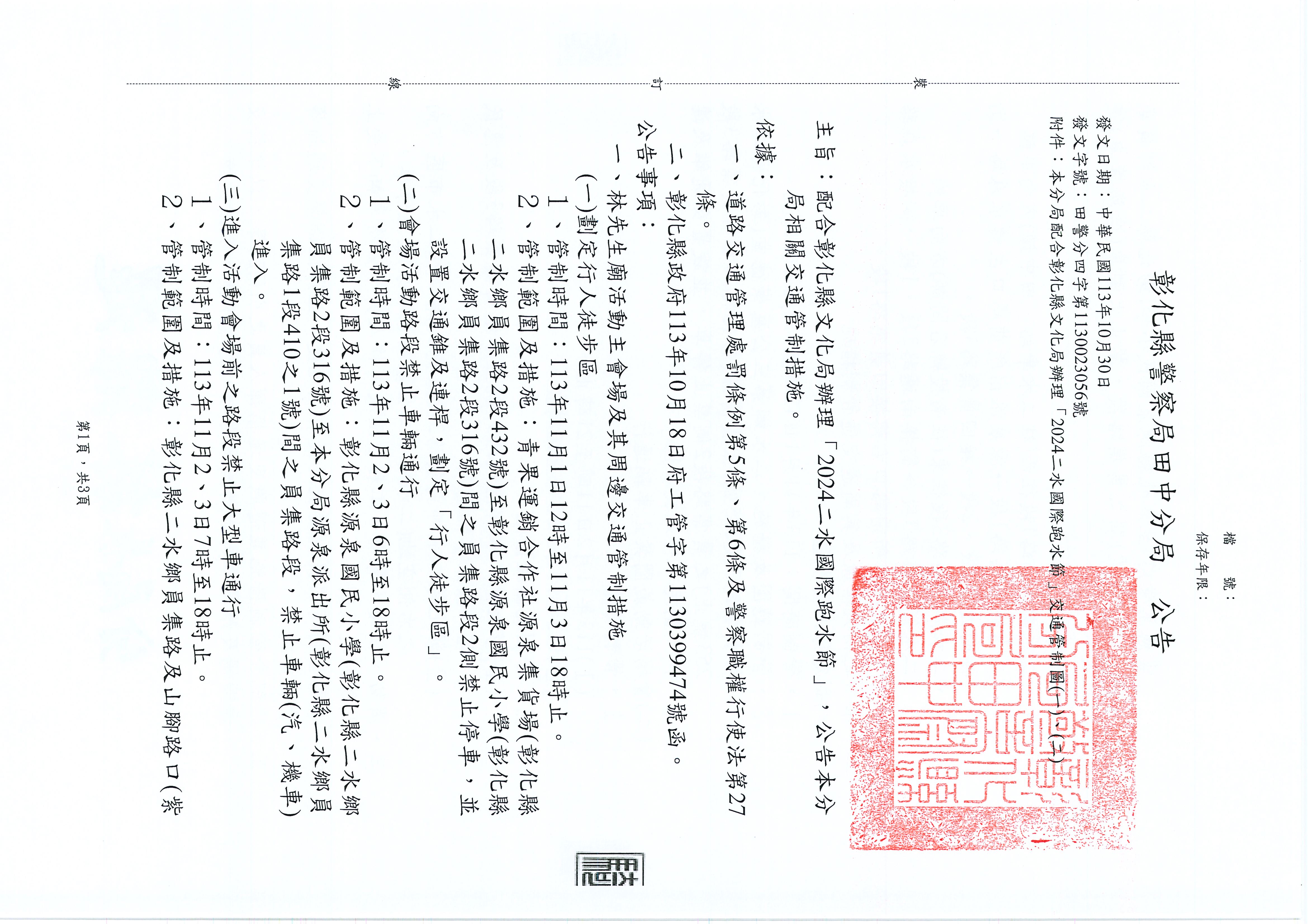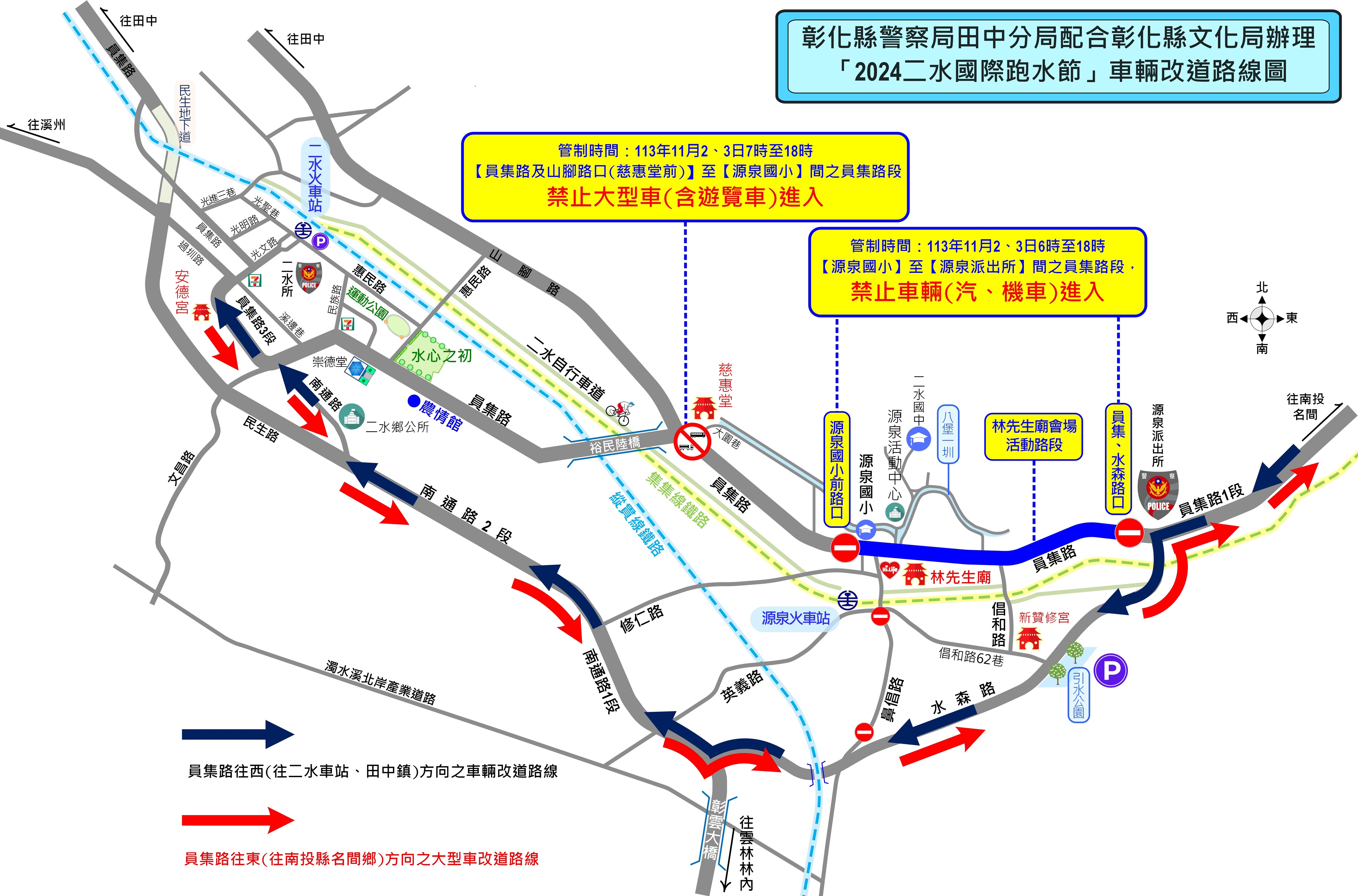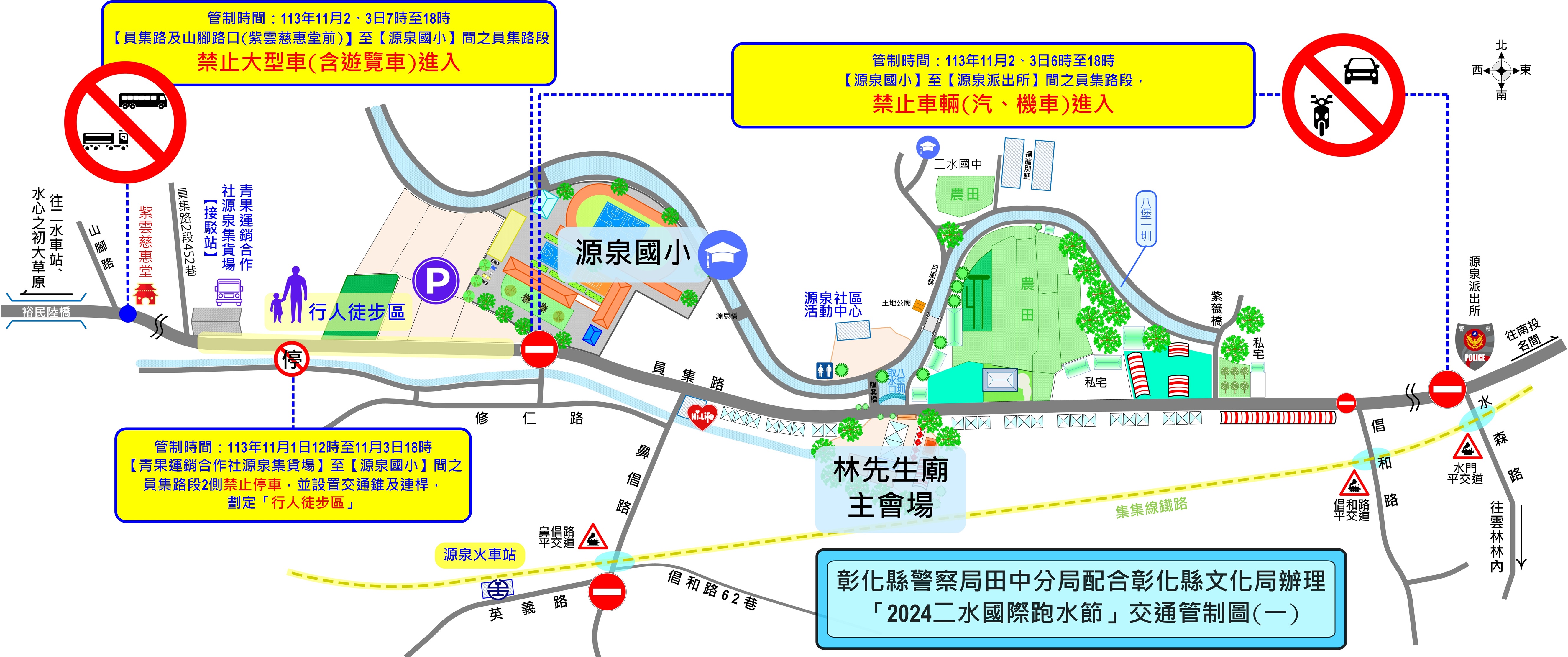 本分局配合彰化縣文化局於113年11月2、3日辦理「2024二水國際跑水節」,將管制「林先生廟會場」周邊之員集路段及「水心之初大草原」周邊之員集(惠民)路段,請鄉親配合相關交通管制措施。 如載客前往「林先生廟會場」之遊覽車,請由源泉派出所前之員集、水森路口進入,並於員集、倡和路口前上下客,以避免壅塞。