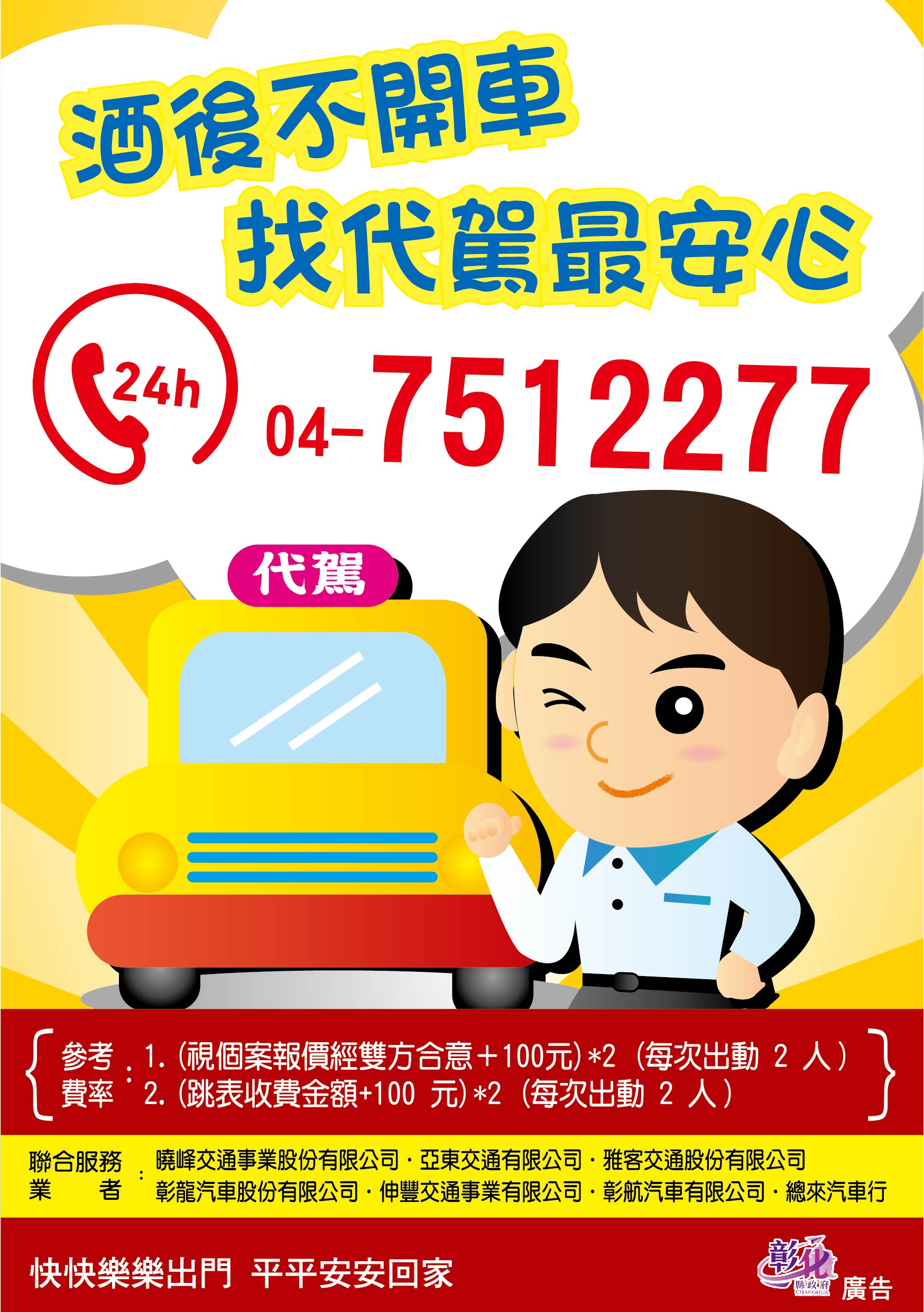 為保障縣民行的安全,除持續「嚴懲酒駕,強力執法」等道安精進作為外,彰化縣政府、彰化監理站整合轄區代駕服務資訊(如附表),提供飲酒民眾及販酒業者(如餐廳、KTV、小吃店等)能多加利用。