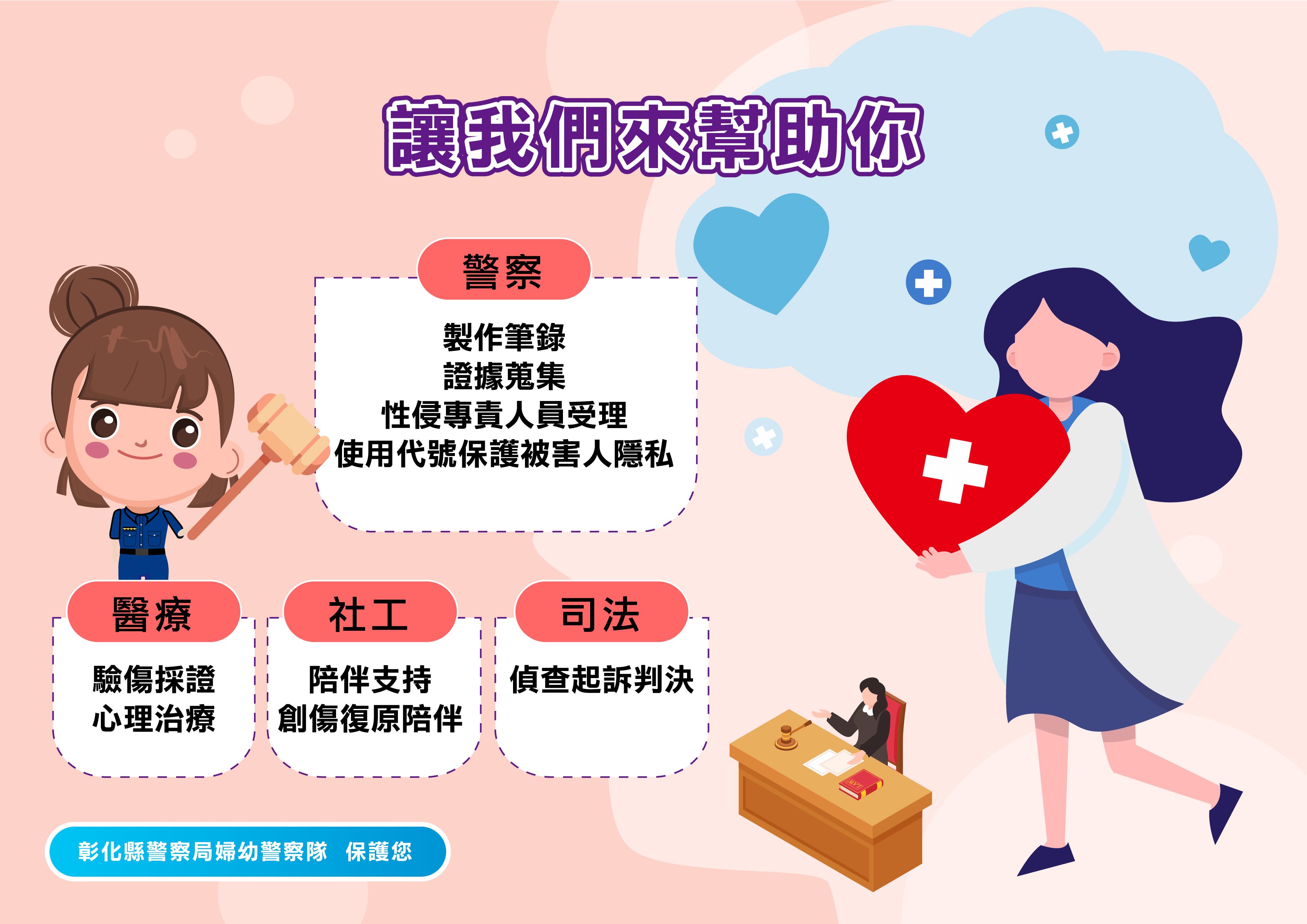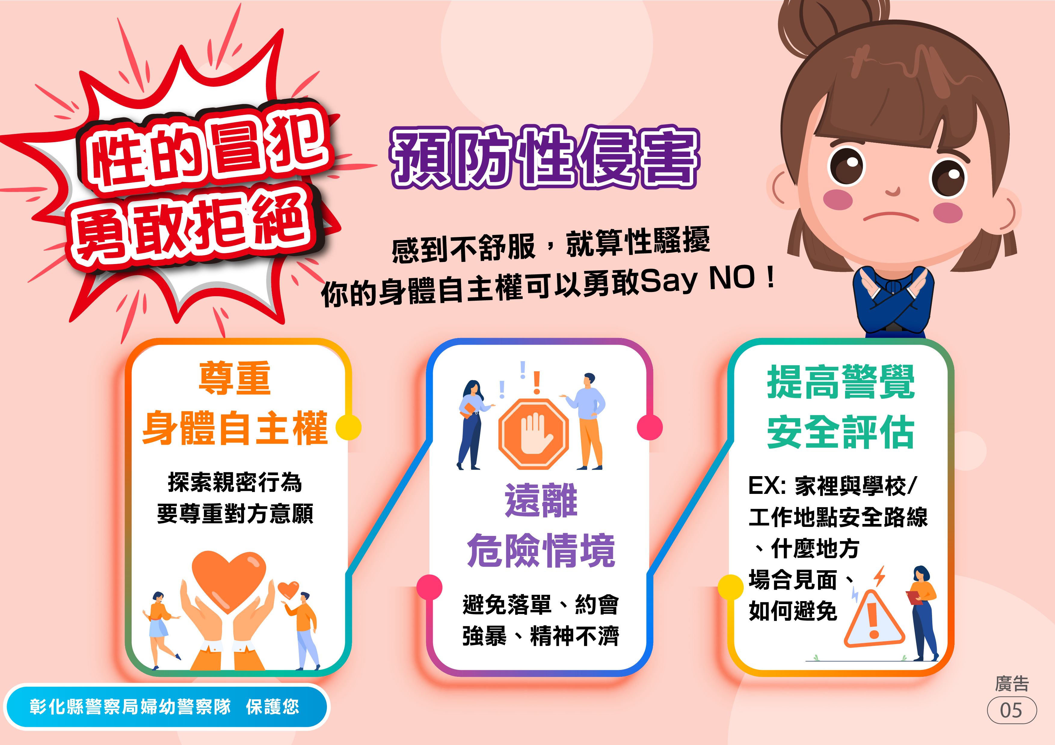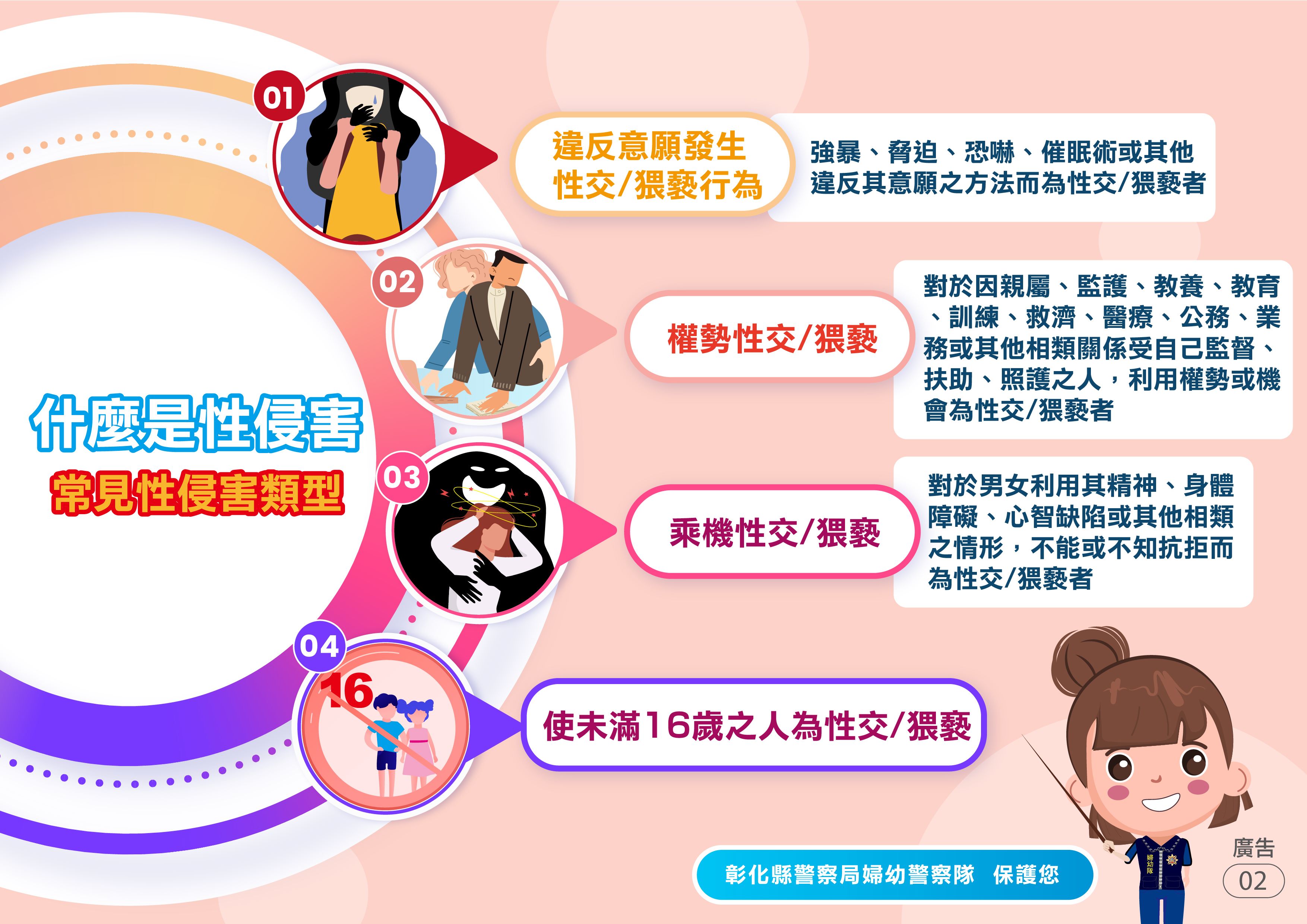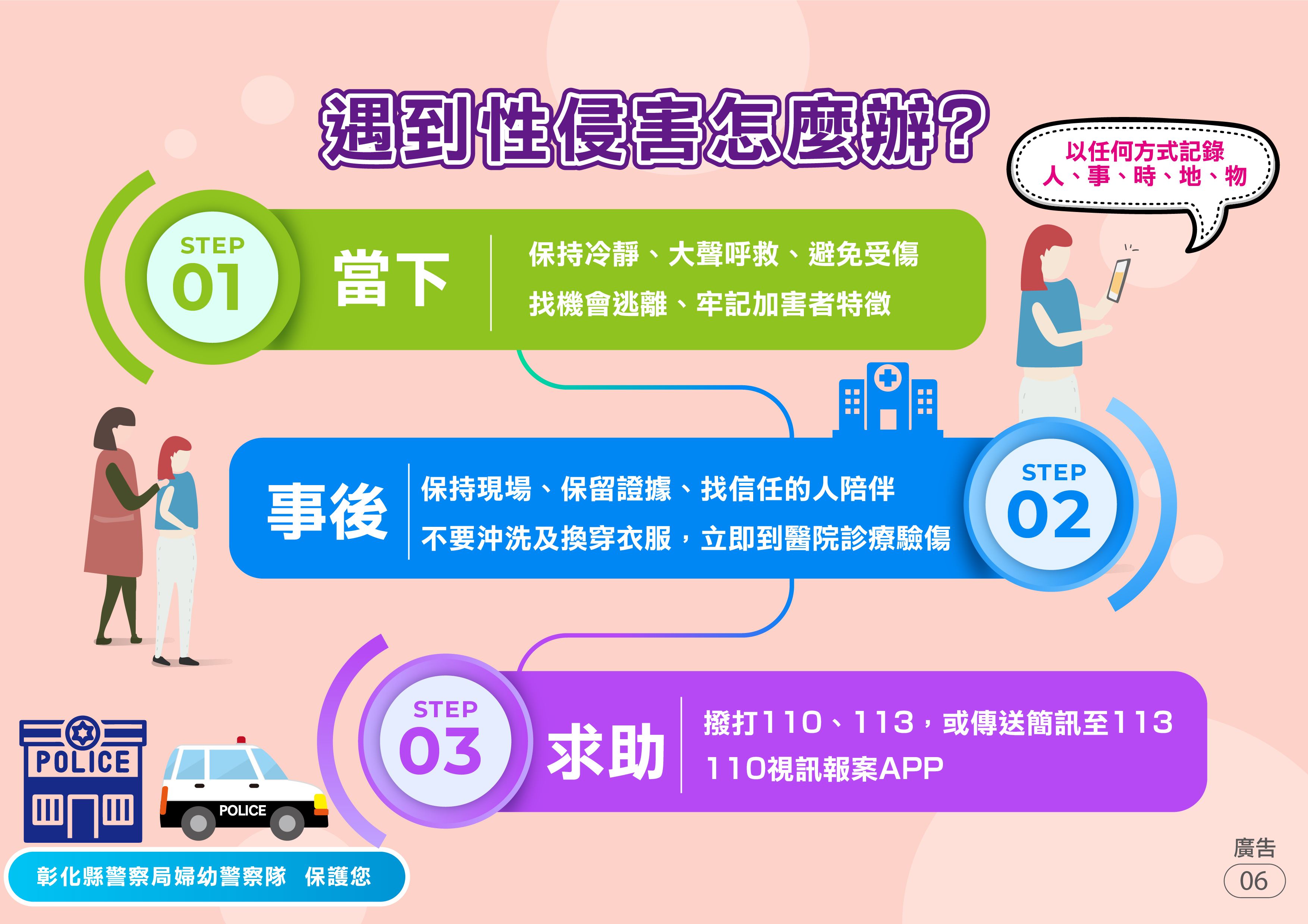 本局婦幼警察隊提供「性侵害防治」懶人包,讓民眾能精簡瞭解什麼是性侵害?如何避免被性侵的風險?被性侵了要怎麼辦?有誰可以提供協助?更多婦幼安全宣導相關資訊請參閱彰化縣警察局婦幼警察隊Facebook粉絲專頁。