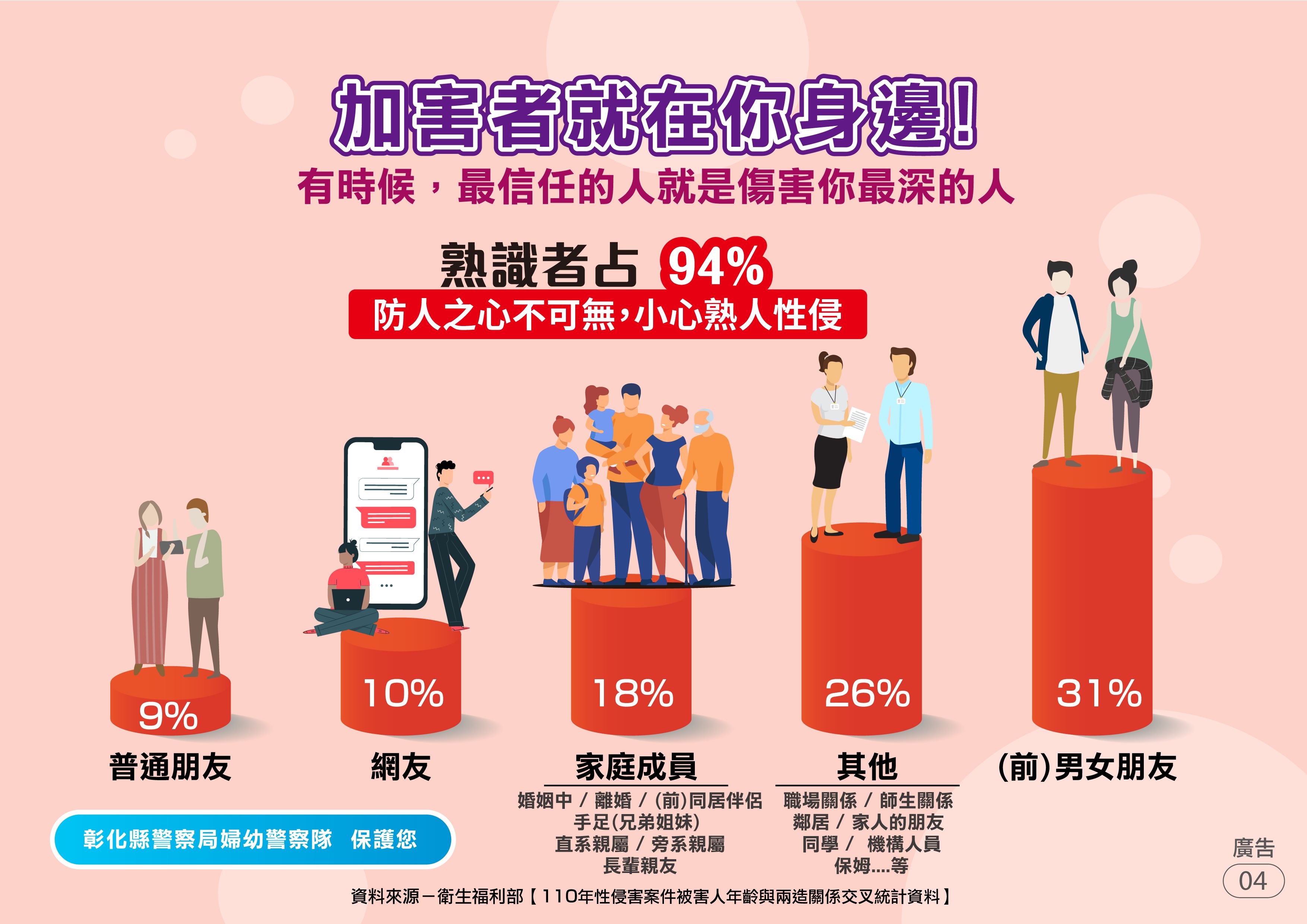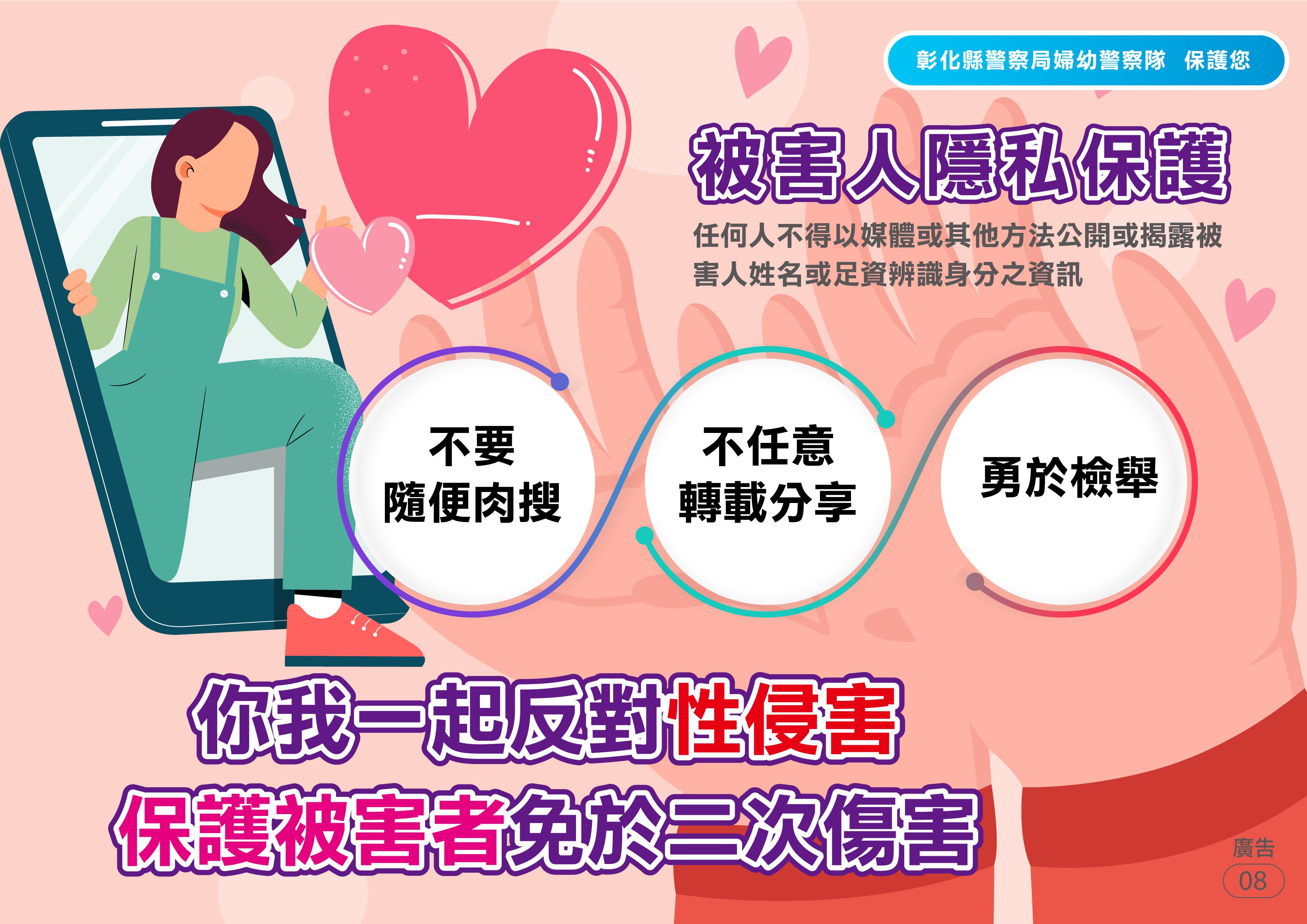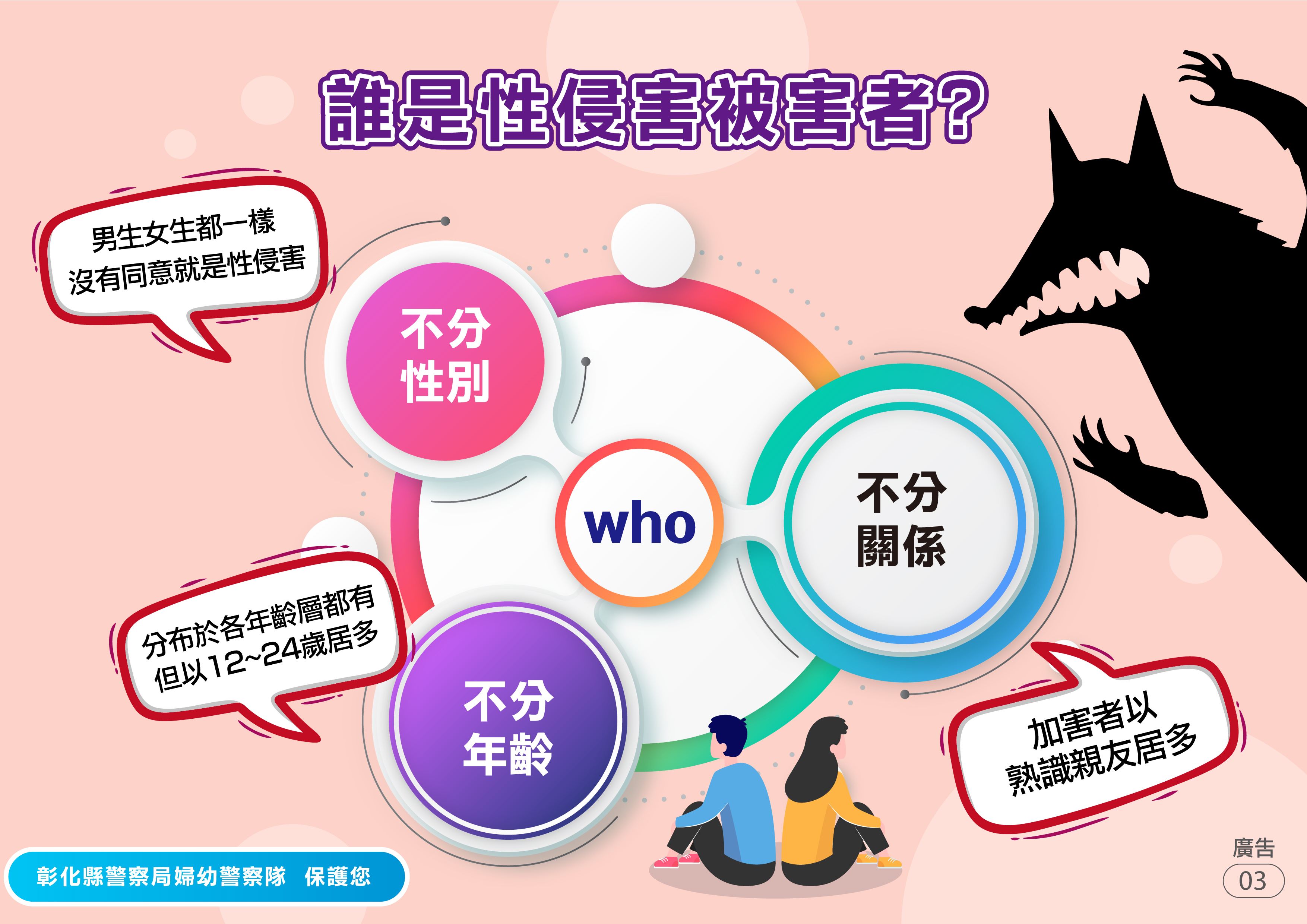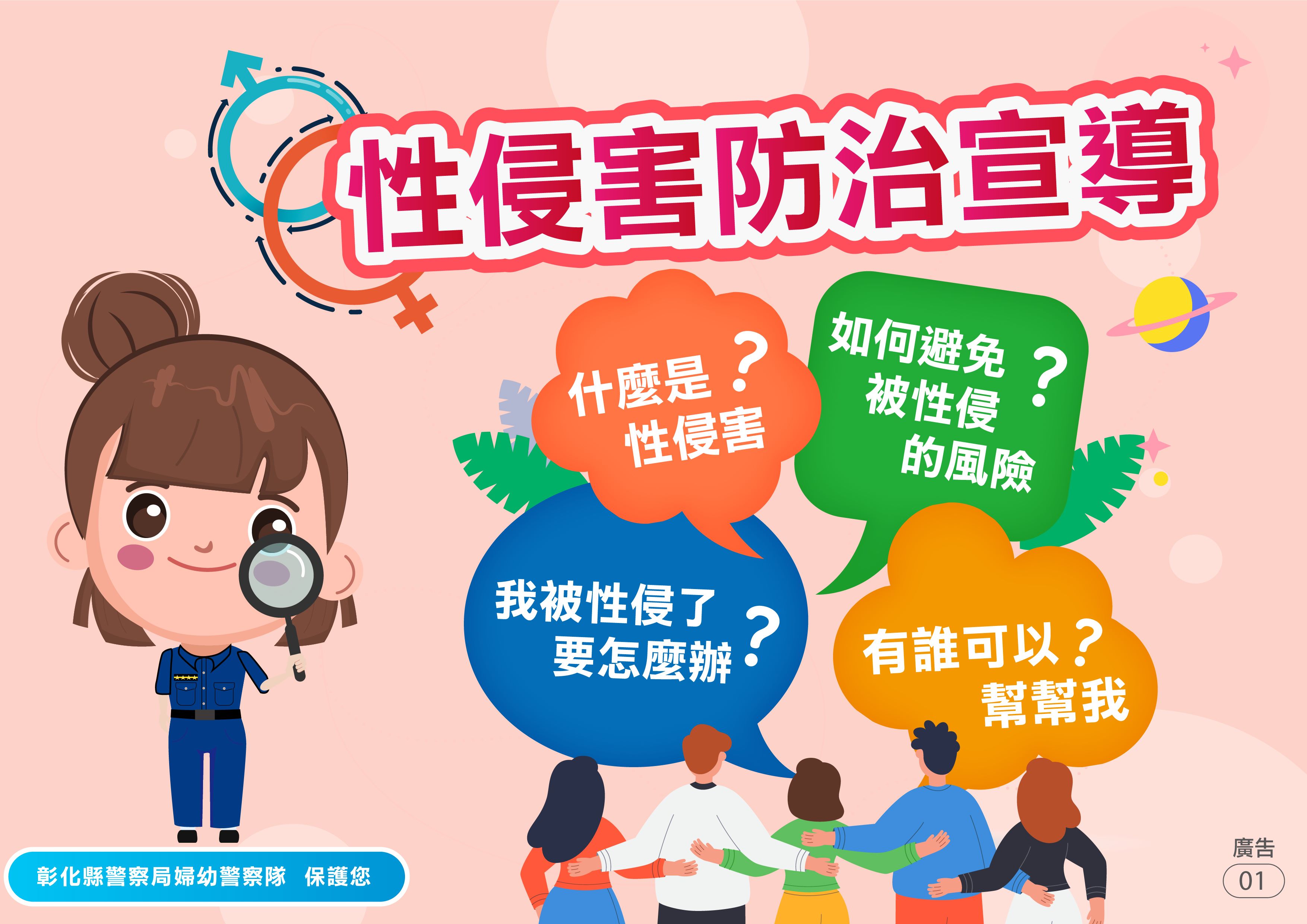 本局婦幼警察隊提供「性侵害防治」懶人包,讓民眾能精簡瞭解什麼是性侵害?如何避免被性侵的風險?被性侵了要怎麼辦?有誰可以提供協助?更多婦幼安全宣導相關資訊請參閱彰化縣警察局婦幼警察隊Facebook粉絲專頁。
