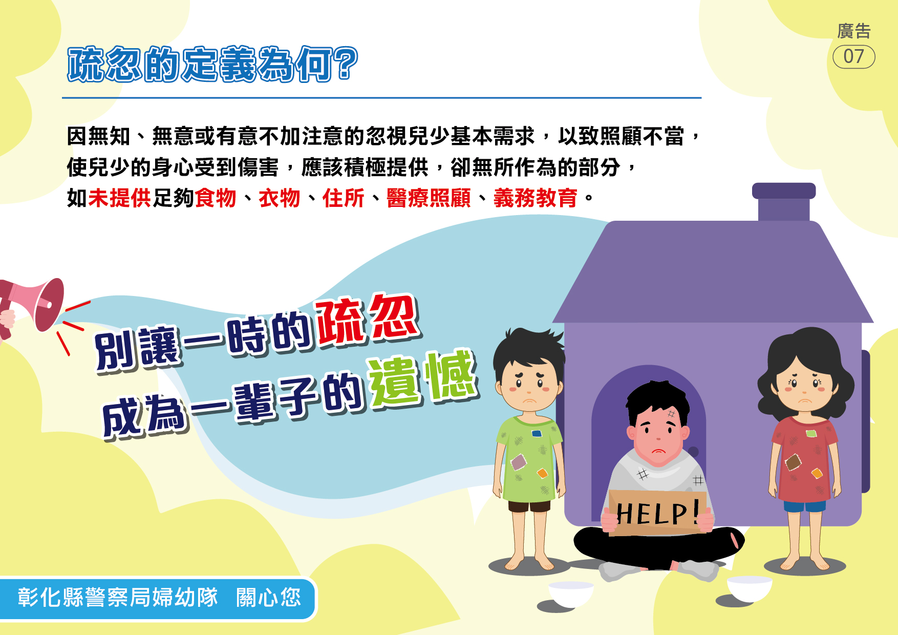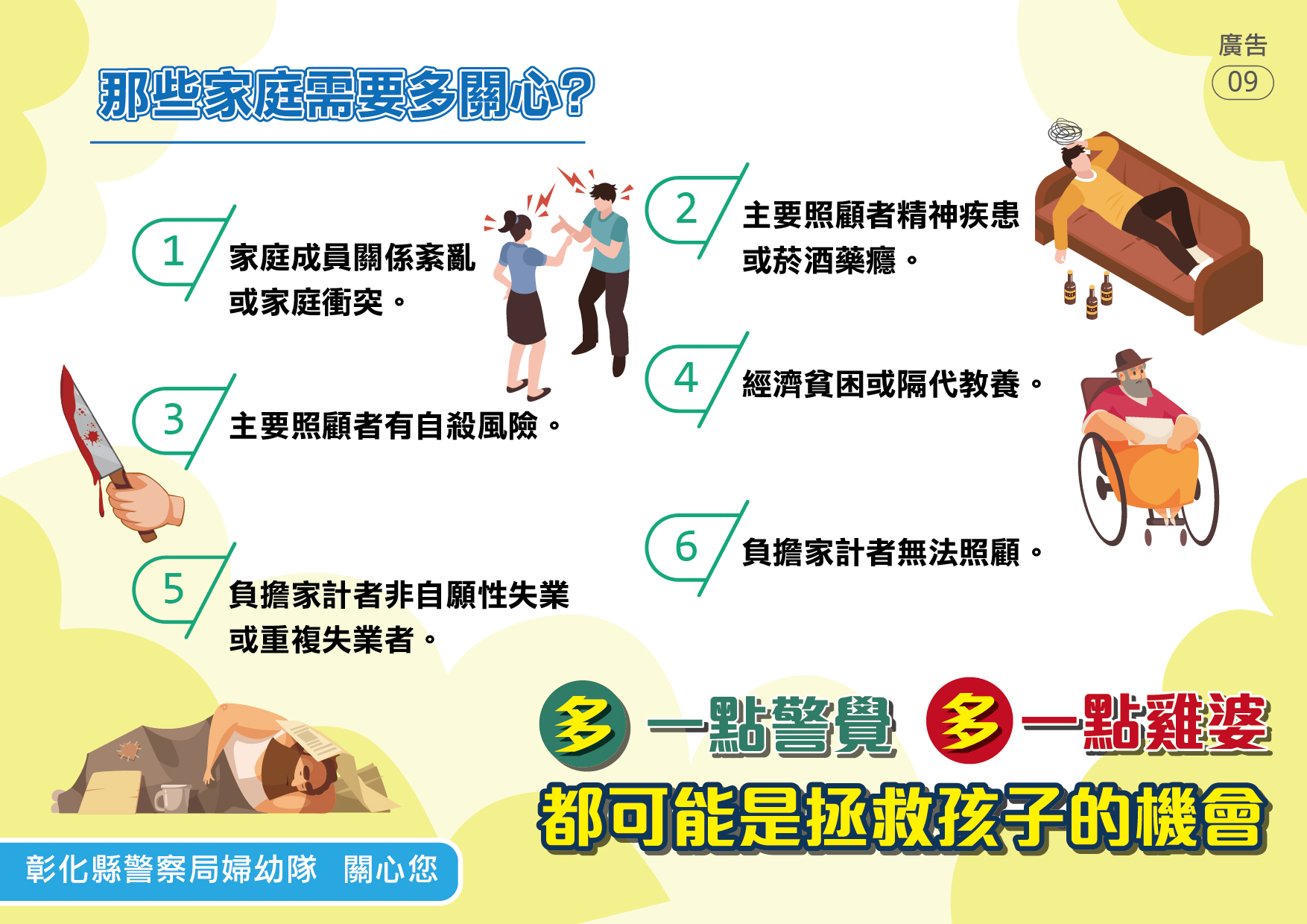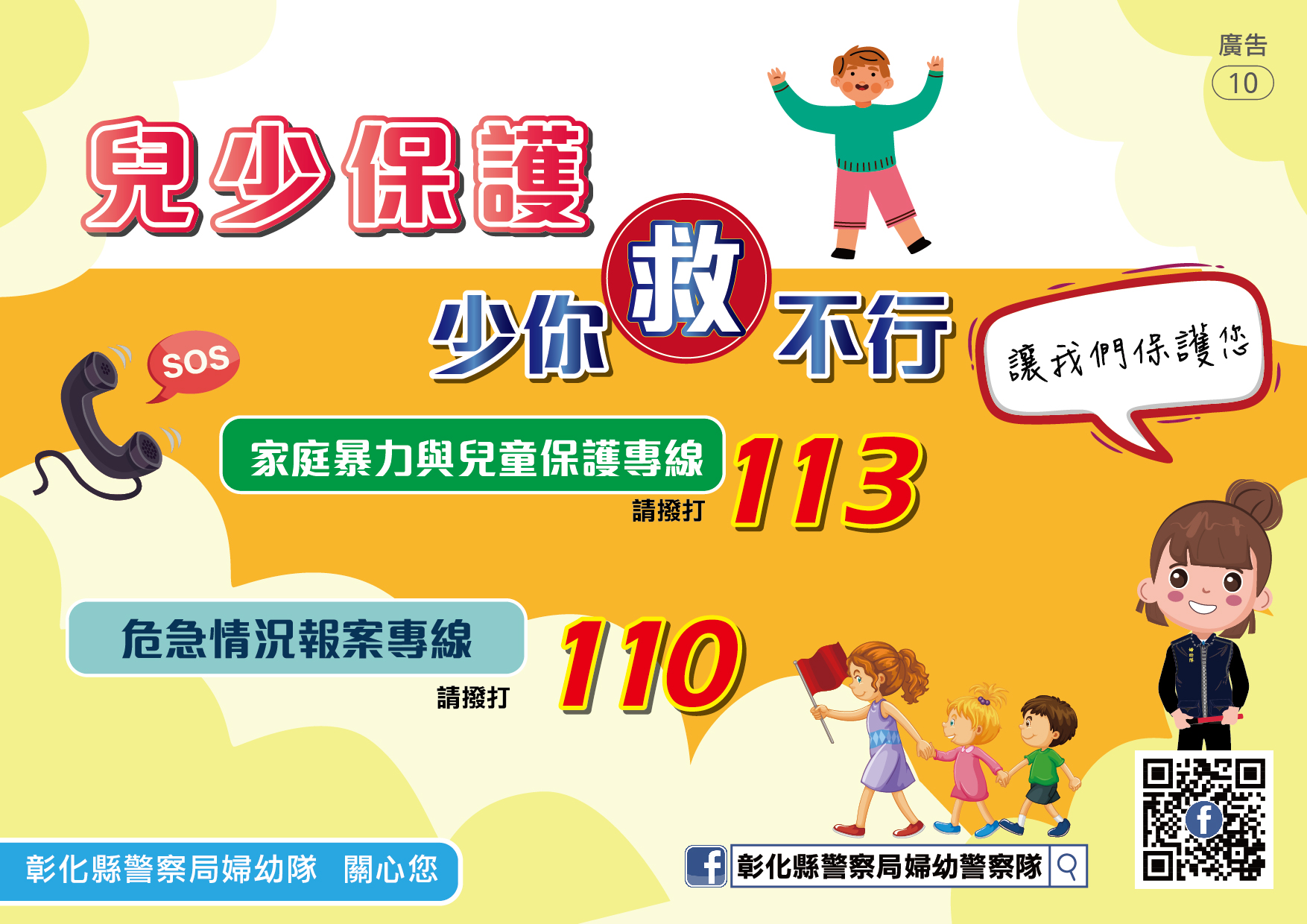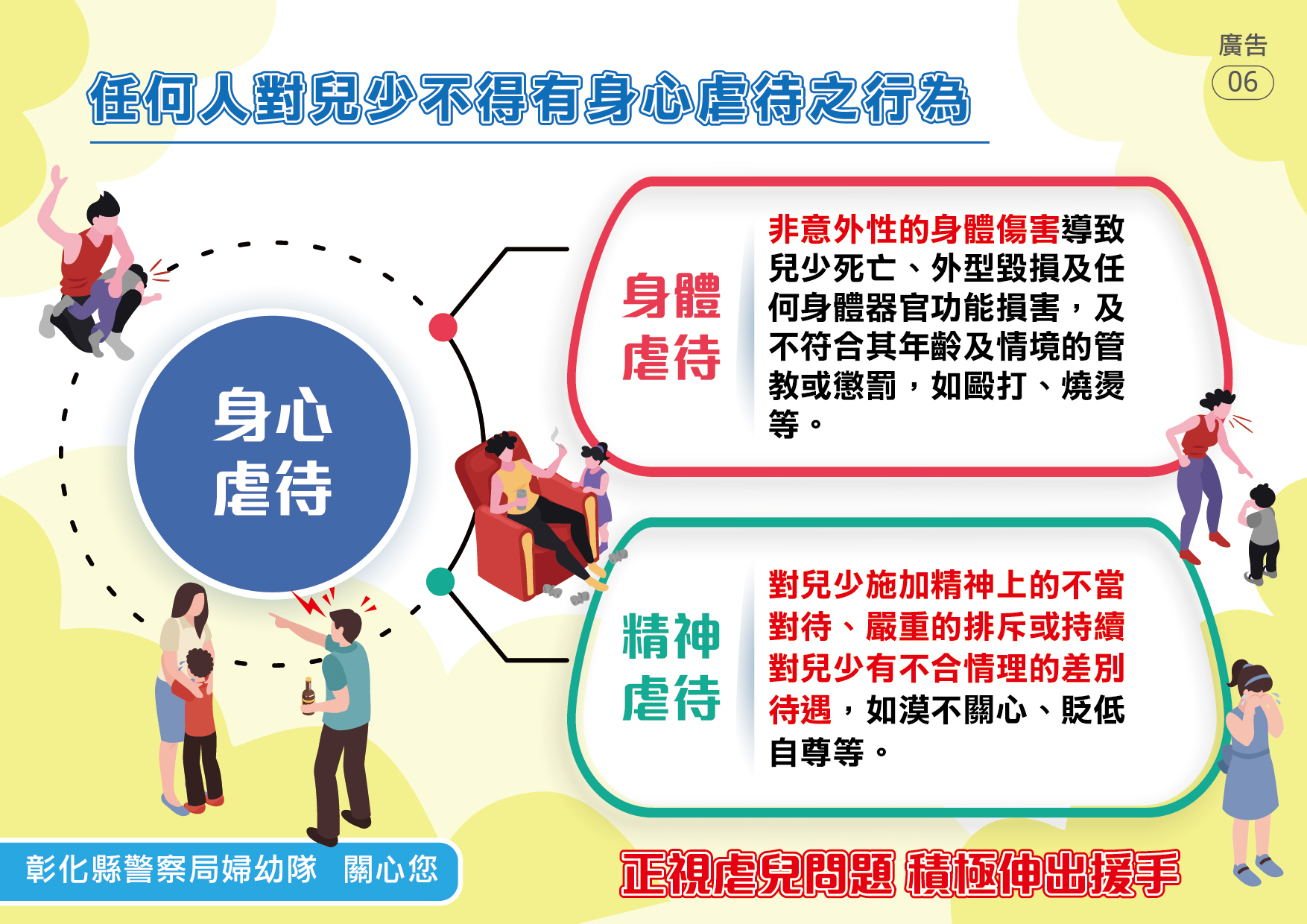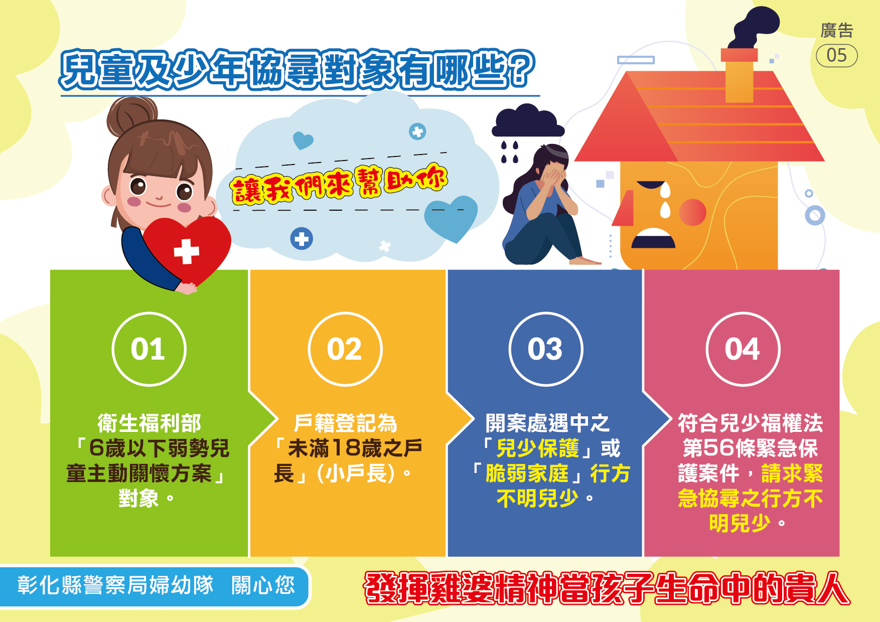 本局婦幼警察隊提供「兒少保護」懶人包,讓民眾能精簡瞭解哪些家庭需要多關心?保護的對象有哪些人?常見的態樣有哪些?如何求助?更多婦幼安全宣導相關資訊請參閱
