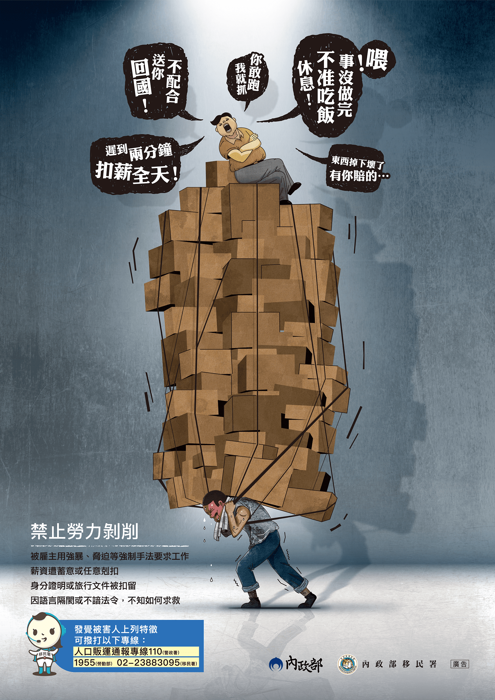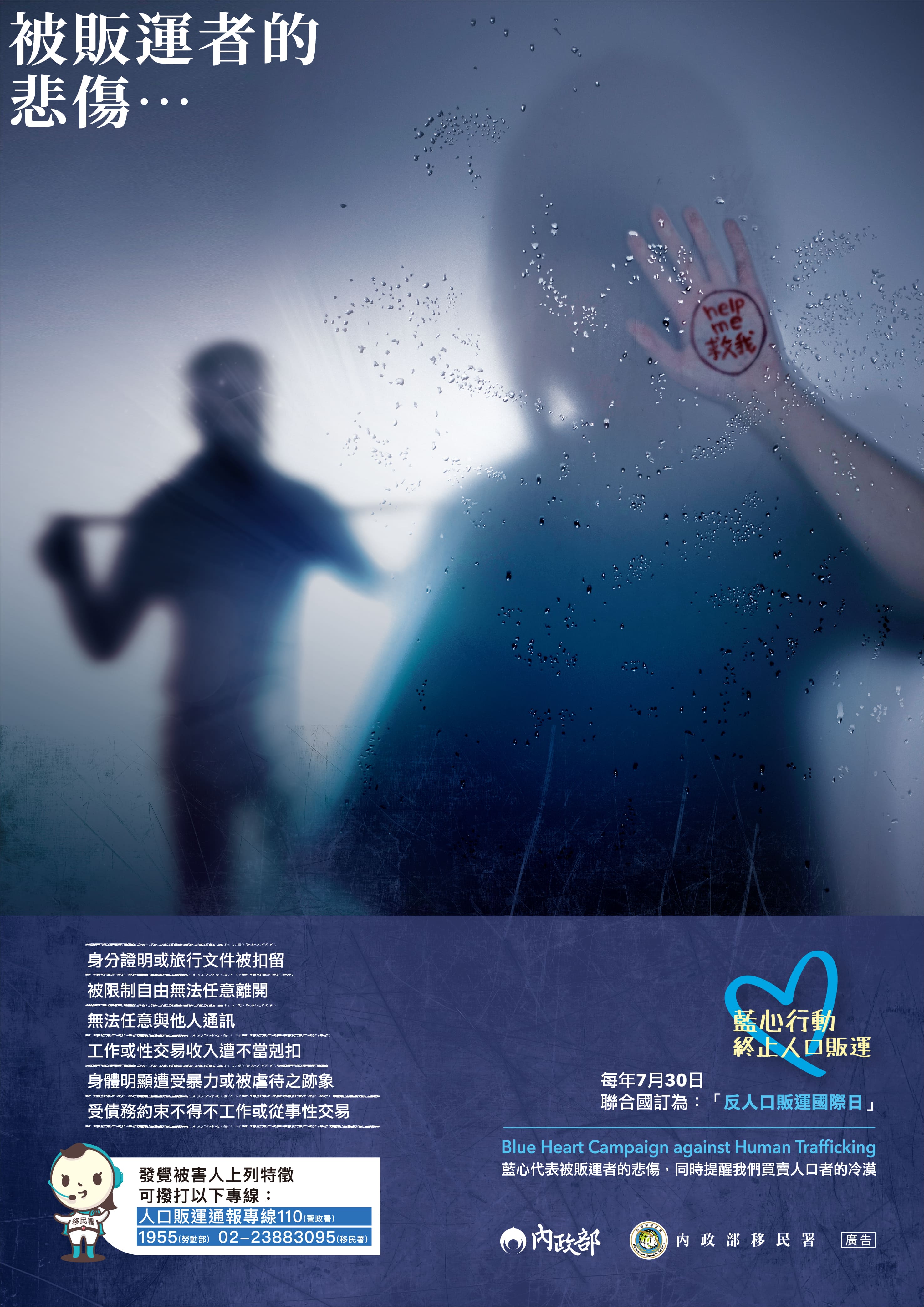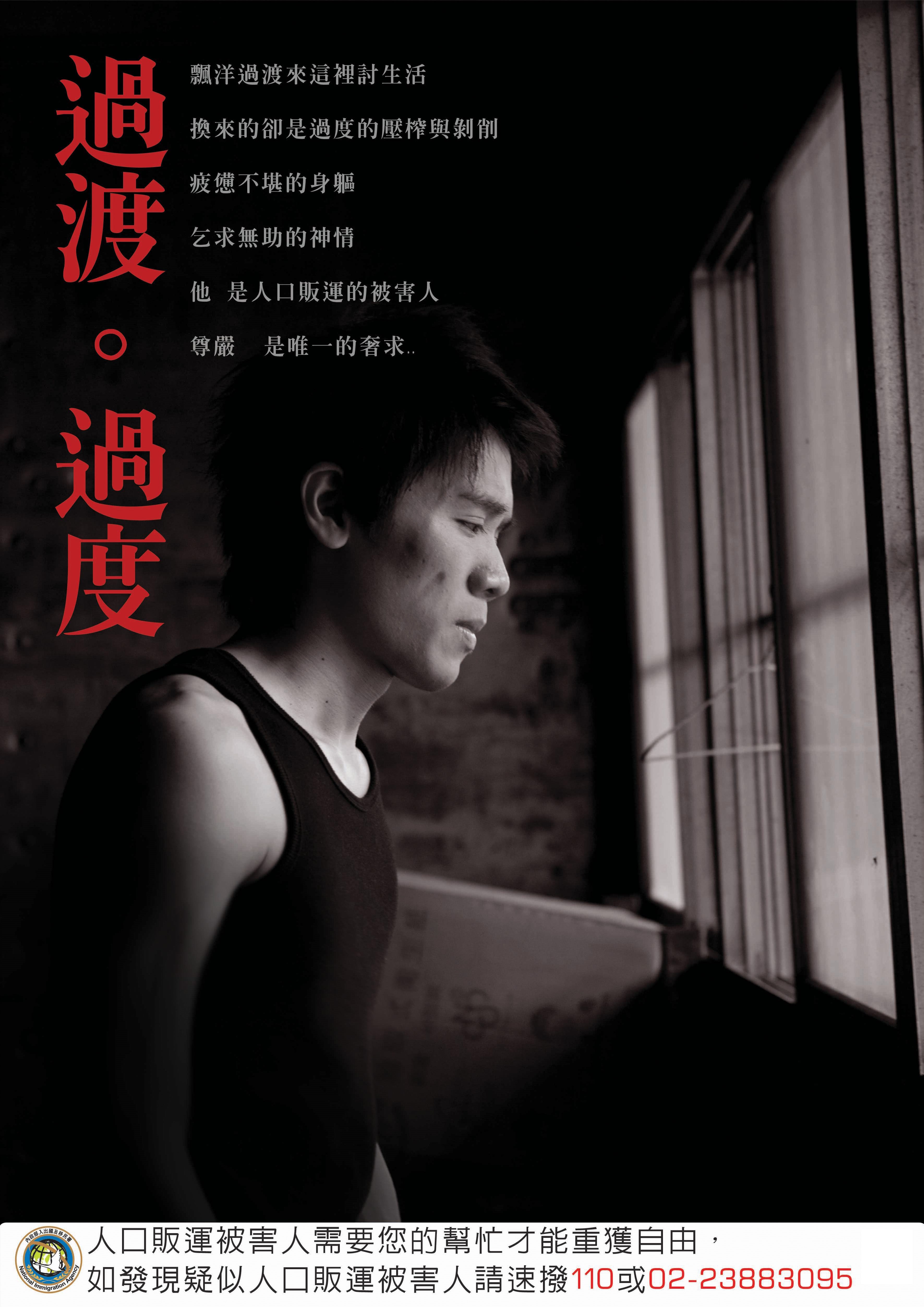 人口販運被害人需要您的幫忙才能重獲自由,如發現疑似人口販運被害人請速撥110或02-23883095求助。