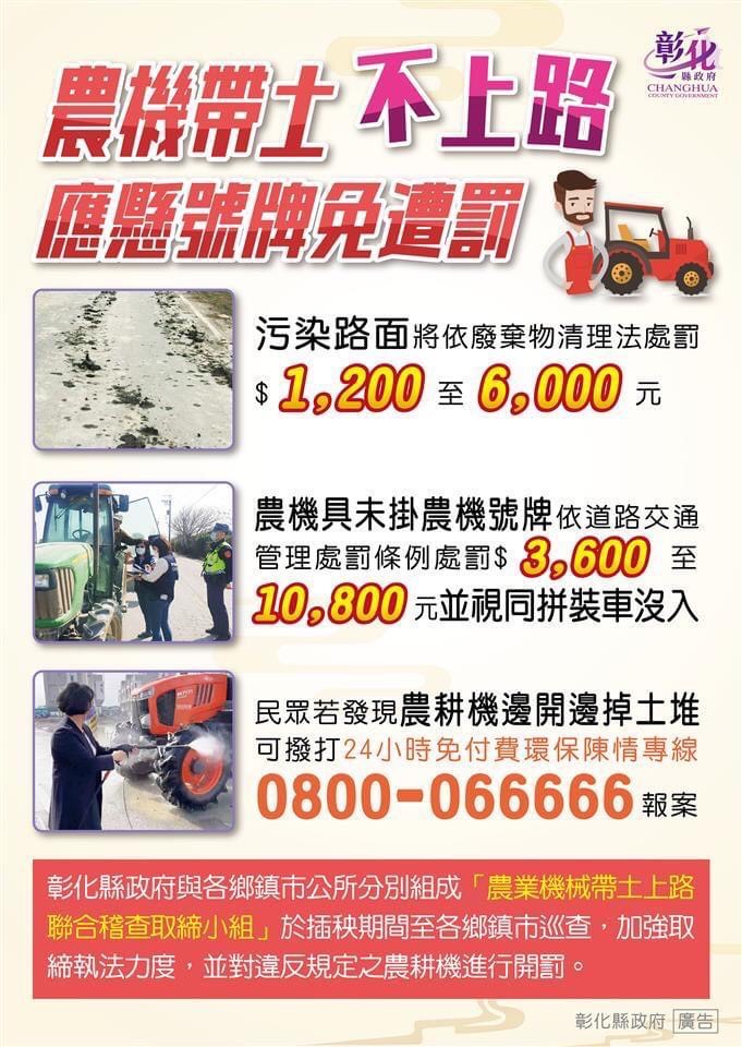 彰化縣政府與各鄉鎮市公所分別組成「農業機械帶土上路聯合稽查小組」於插秧期間至各鄉鎮市巡查,加強取締執法力度,並對違反規定之農耕機進行裁罰。