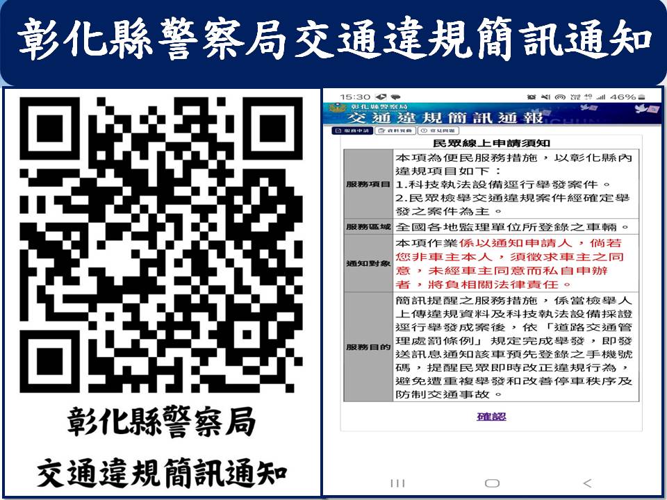 交通隊表示,「交通違規簡訊通知服務」從今天起,正式上線,車主可至彰化縣警察局全球資訊網→主題宣導→交通違規簡訊通報申請,透過手機號碼驗證或掃描 QR Code 進入網頁辦理。